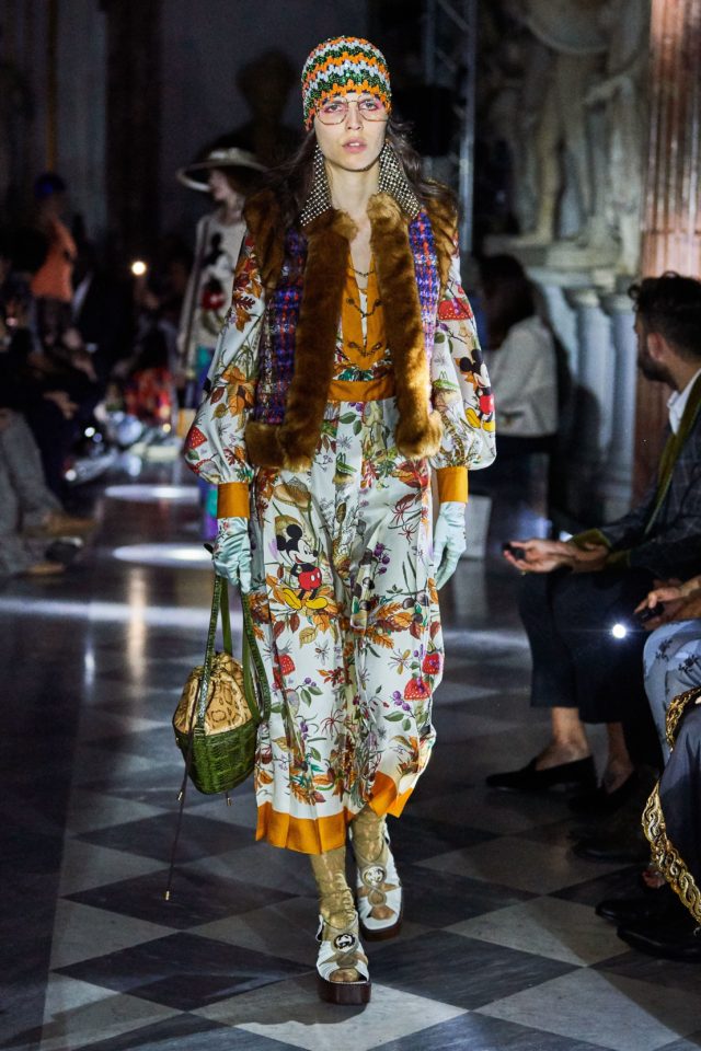 La colección es el epicentro de la nueva campaña de la maison que relata la vida del famoso ratón con el parque temático de Disneyland como telón de fondo. El director creativo de la casa italiana, Alessandro Michele, ha diseñado varias piezas de vestir y complementos en los que se incluye a Mickey Mouse. La línea ‘ready-to-wear’ cuenta con un nuevo material que está muy presente en varias de las piezas, la lona Supreme Mini GG con el estampado del personaje animado. » prêt-à-porter» incluye una oferta prendas y complementos que van desde camisetas, tops o sudaderas hasta calzado, bolsos e incluso pequeños artículos de piel, pañuelos y bufandas.