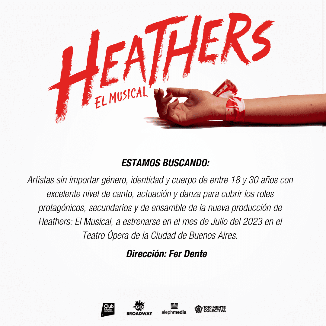 Los productores de Heathers, Valentina Berger, CEO de GO Broadway Productions, José Luis Massa de Club Media Network junto a Fernando Sokolowitz de Aleph Media abren convocatoria a audiciones para artistas entre 18 y 30 años, sin importar género, identidad y cuerpo, con excelente nivel de canto, actuación y danza para cubrir los roles protagónicos, secundarios y de ensamble. Se podrán inscribir enhttps://linktr.ee/heatherselmusical y la fecha límite es el 24 de Octubre.