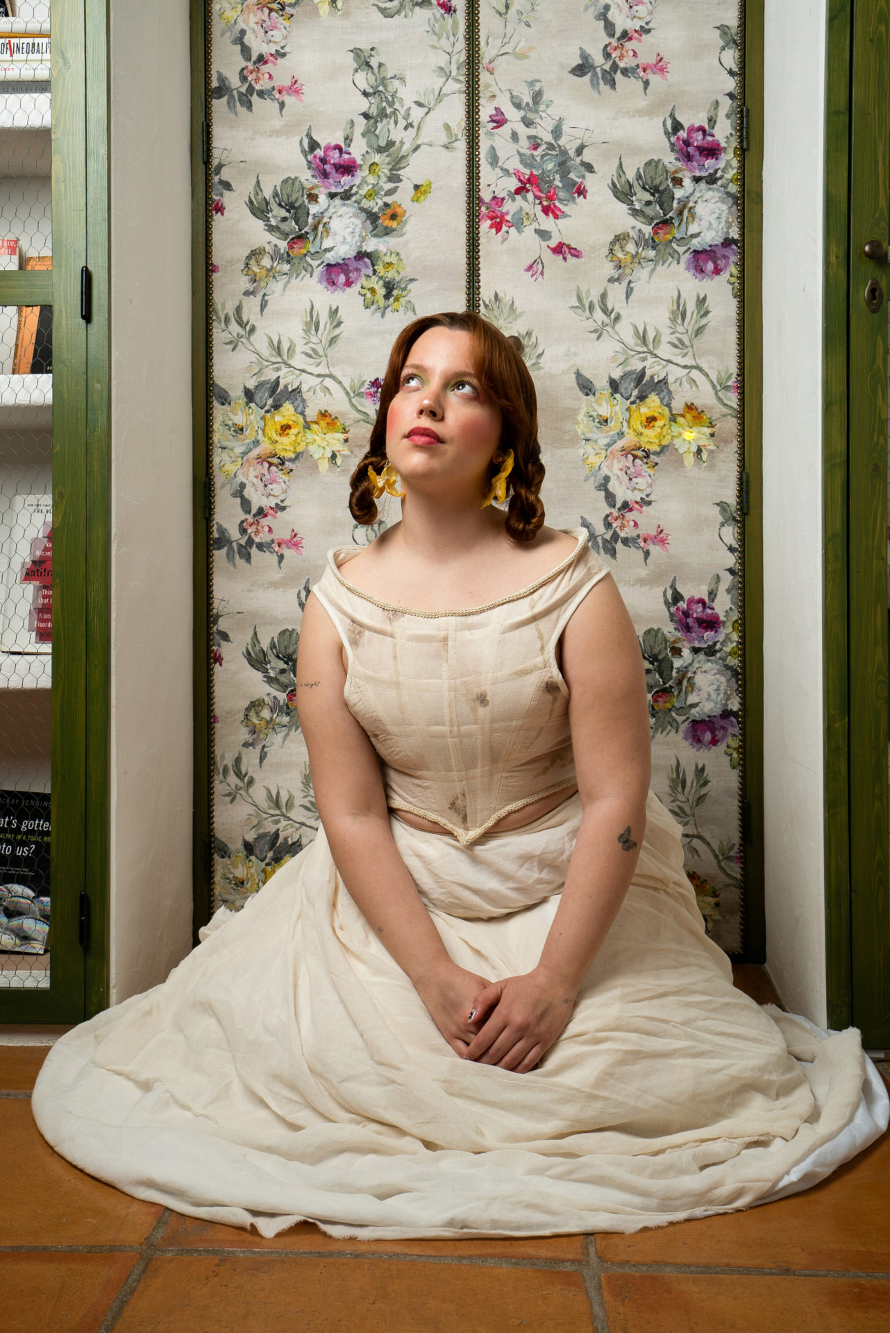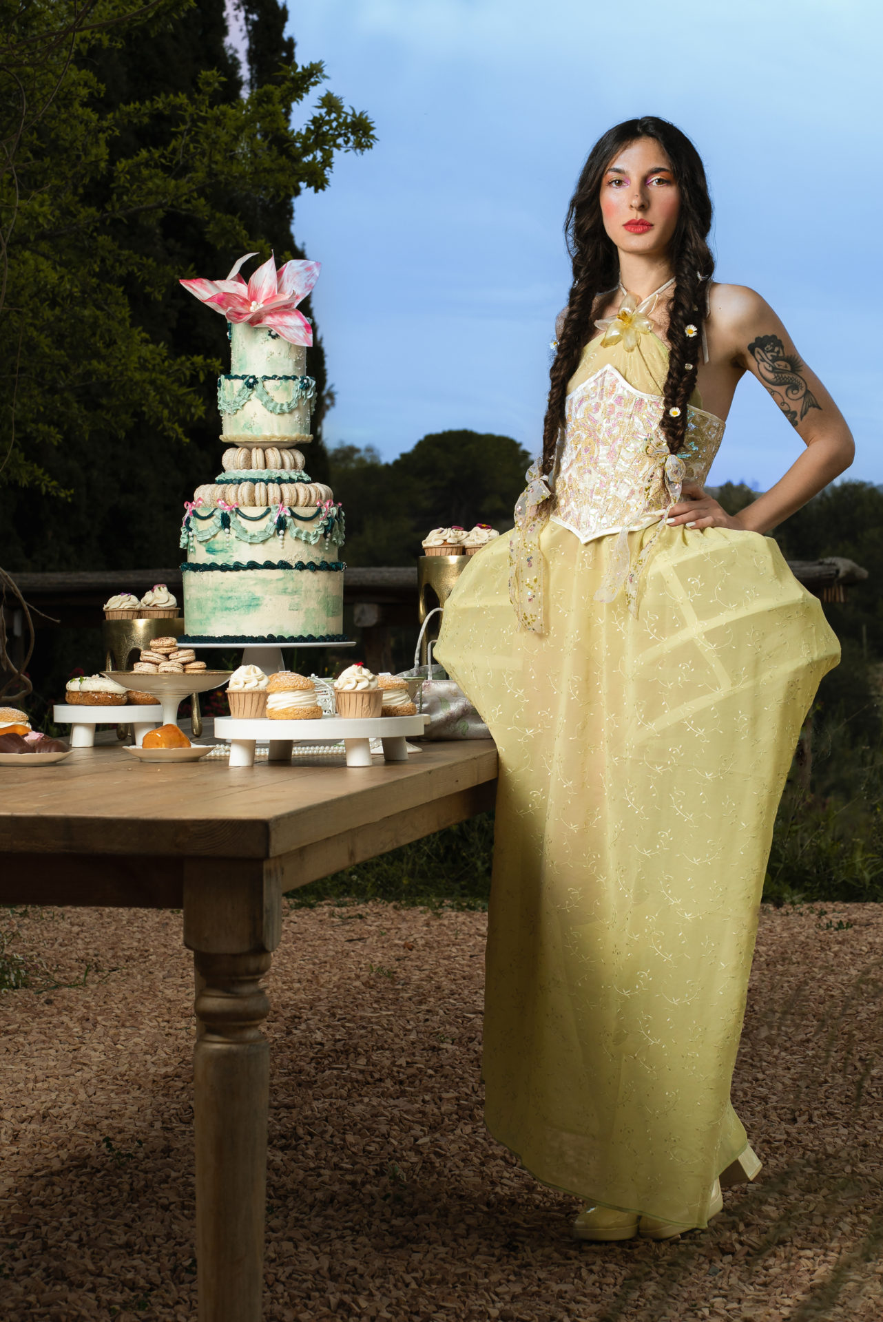 Inicialmente bauticé esta colección como “Rococo Ibicenco,” ya que me imaginaba un universo de rituales de cortejo y picnics en un entorno natural y armonioso a mediados del siglo XVIII en la isla de Ibiza. Los vestidos están creados principalmente con una gasa ibicenca acompañada de estructuras de miriñaques, en las que he incorporado diferentes técnicas artesanales textiles, desde la estampación natural de flores hasta ornamentos florales en resina. La joyería floral está inspirada en los collares que puso de moda Madame de Pompadour.