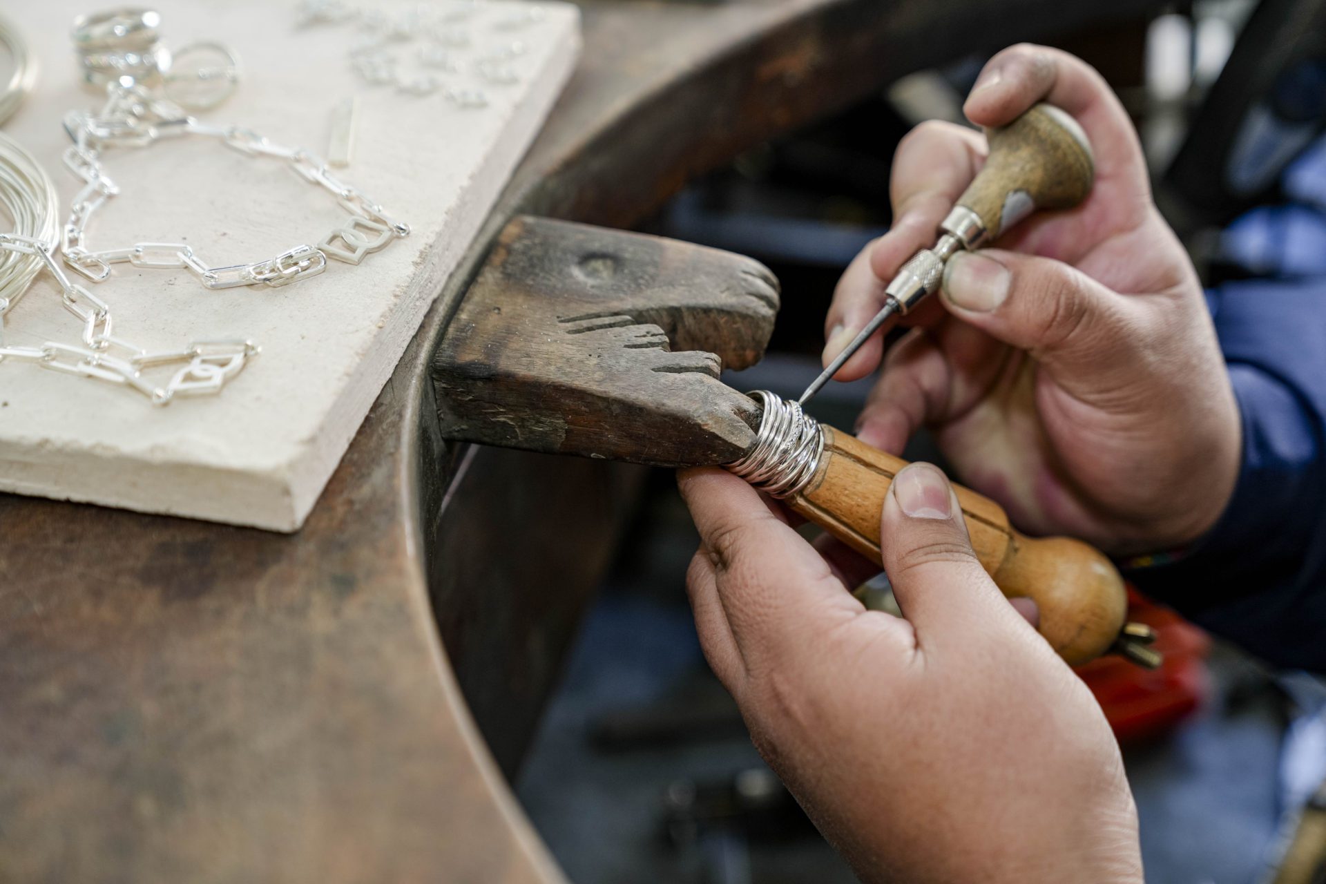 Actualmente la mayoría de las joyas se diseñan en 3D para que cumplan los estándares esperados a nivel internacional, y algunos modelos se fabrican utilizando técnicas tradicionales. Una vez fabricados los originales, se realizan las gomas (matrices) que se emplean para replicar las joyas con la técnica de fundición en cera perdida. De este proceso se obtienen las piezas en plata u oro, que son como pequeñas esculturas en bruto. Y allí comienza el trabajo de devastado manual y pulido mecánico.