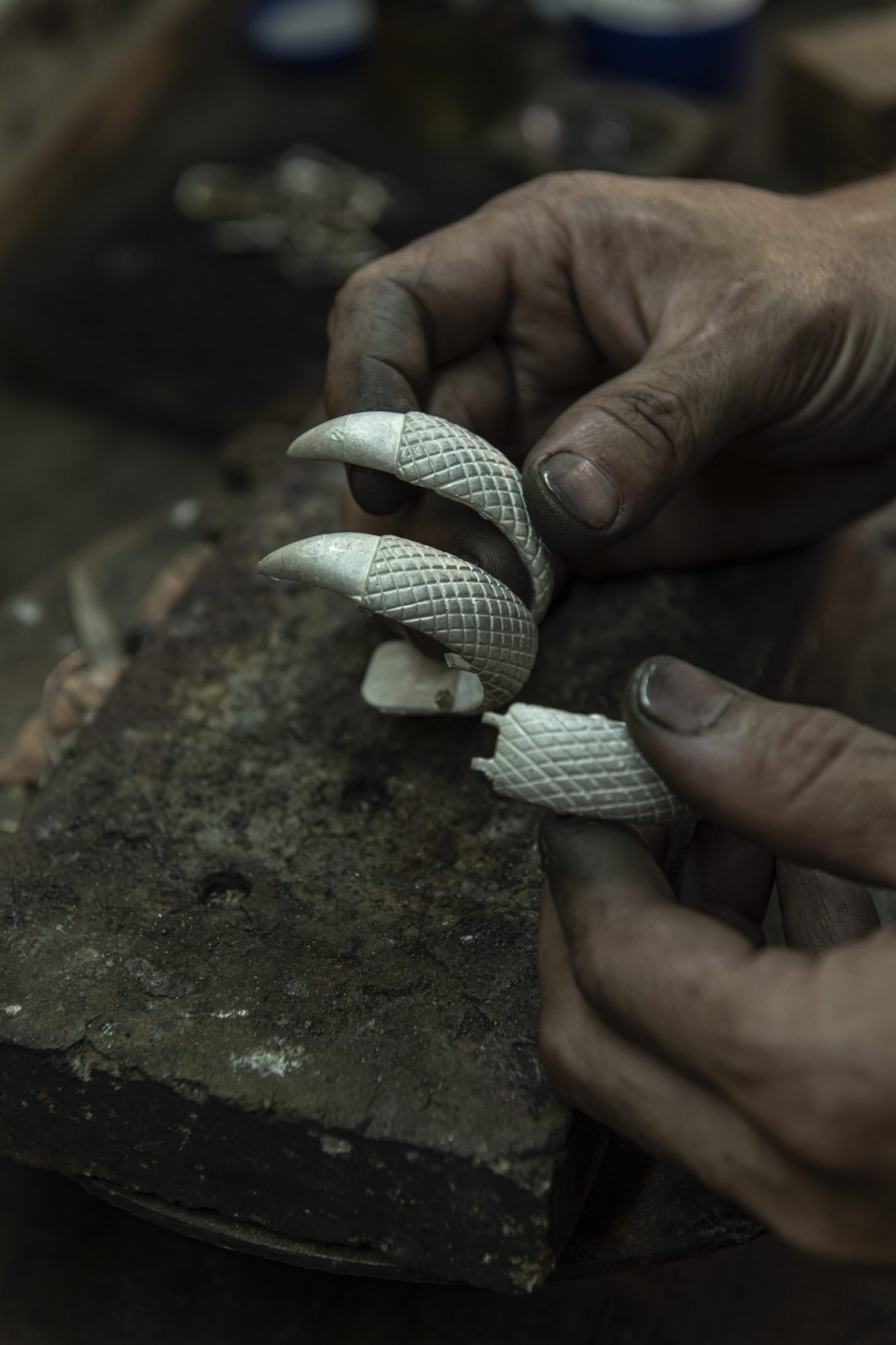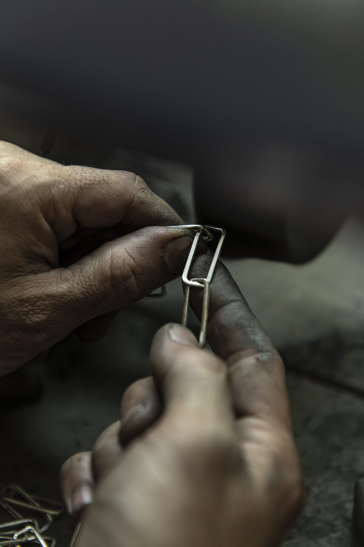 Por último, las materias primas proceden de la reelaboración de piezas vintage, joyas rotas y residuos de talles. El oro y la plata se recogen, funden y transforman en nuevas aleaciones que utilizamos para hacer nuestras piezas.