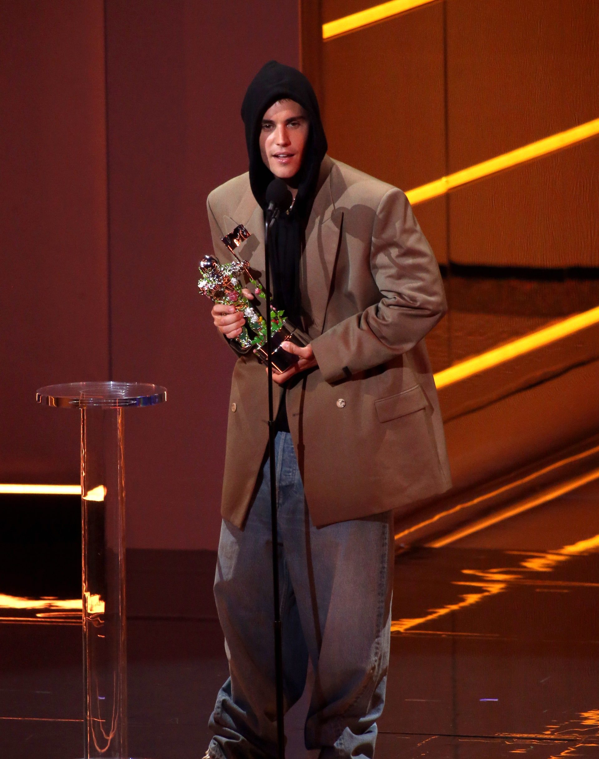 Sobra decir que Bieber siempre ha sentido debilidad por la moda. Ha experimentado anteriormente con ropa de muchos tipos, del western al skater-chic pasando por la sastrería tradicional. Pero este año parece que ha dado en el clavo definitivamente con un look que fusiona todos estos elementos de una manera coherente y actual. Por ejemplo, el look con que recogió su premio a mejor cantante de pop en los MTV VMAs aglutinaba a la perfección sus tres prendas clave: blazer oversize, sudadera negra y vaqueros claros.