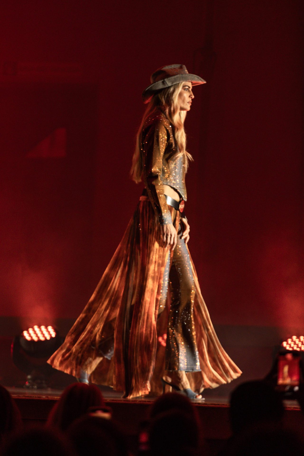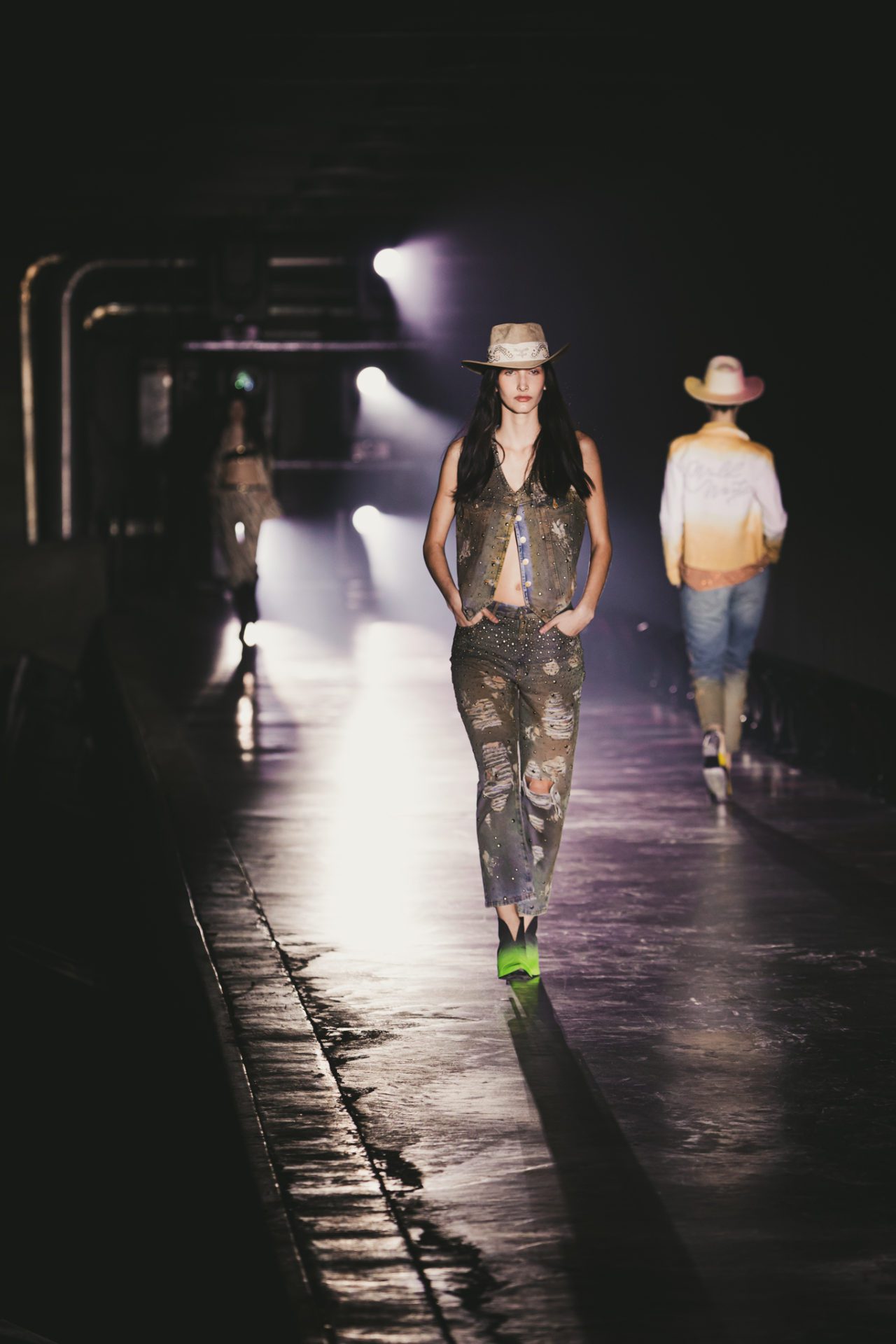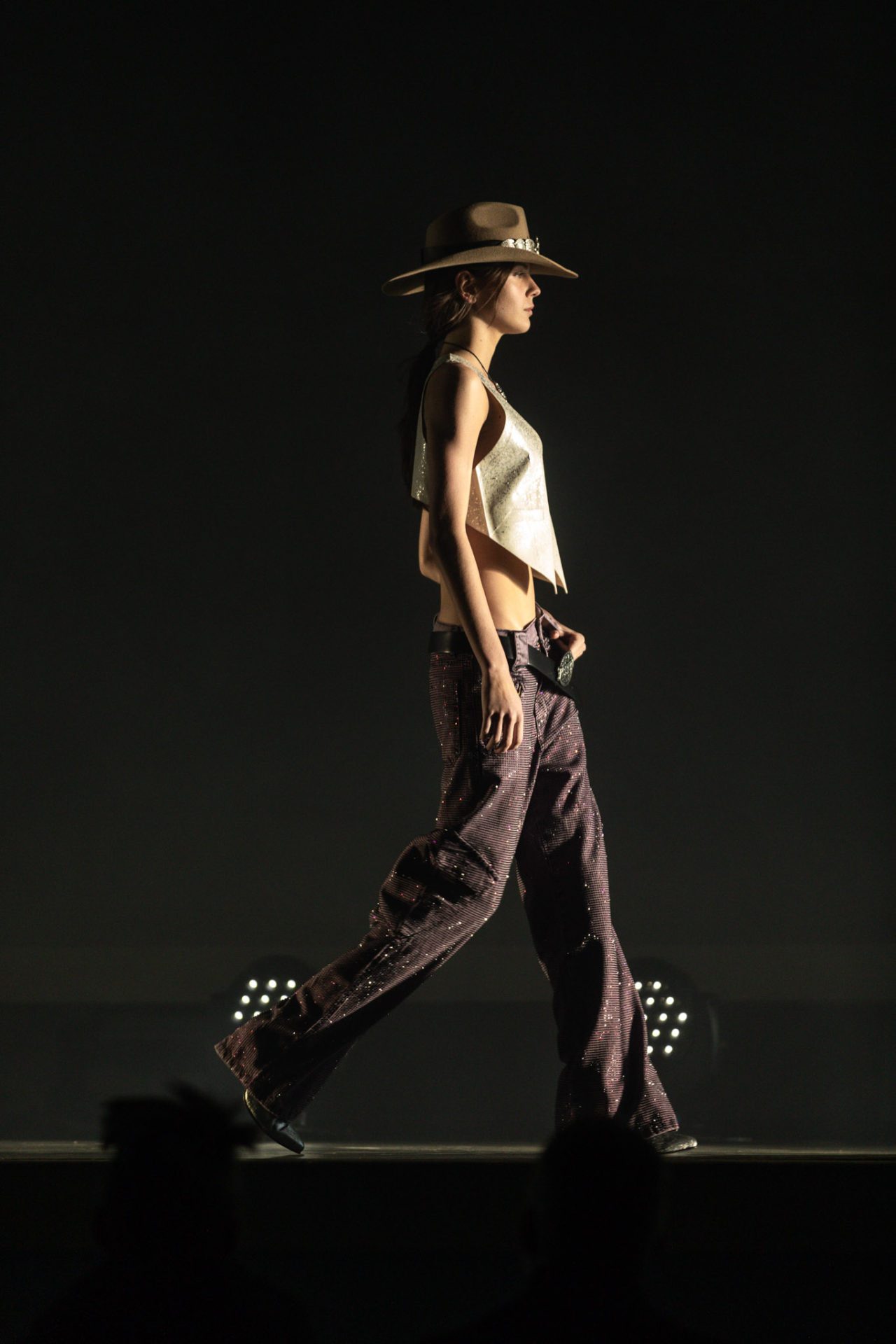 Los bordados de estrellas y guardas en camisas vaqueras y prendas customizadas –camperas, chalecos y pantalones en denim y cuero–  con tachas y strass al estilo cowboy definen a los ítems icónicos de la colección. Además de cinturones con maxi hebillas con el nombre de la marca, botas texanas en distintas variantes y combinaciones de colores, y la inclusión del sombrero cowboy. La abundancia de ornamentos y adornos metálicos se balancea con una materialidad y una paleta que replica la naturaleza del paisaje Western: el suelo, el cielo, el aire, la vegetación, la oscuridad de la noche, la sangre y el sol aparecen representados en el uso del blanco, el negro, los colores tierra, el cuero y sus texturas, las transparencias, el denim desgastado a través de un nuevo custom con pigmentos de la India, lavados, sobreteñidos, desgradés, la yuxtaposición del brillo de los cristales, parte inseparable del ADN de KSK reinterpretada de cara al 2024, y el opaco, el rojo, el verde e interrupciones, suspiros veraniegos, en rosa, amarillo y celeste.