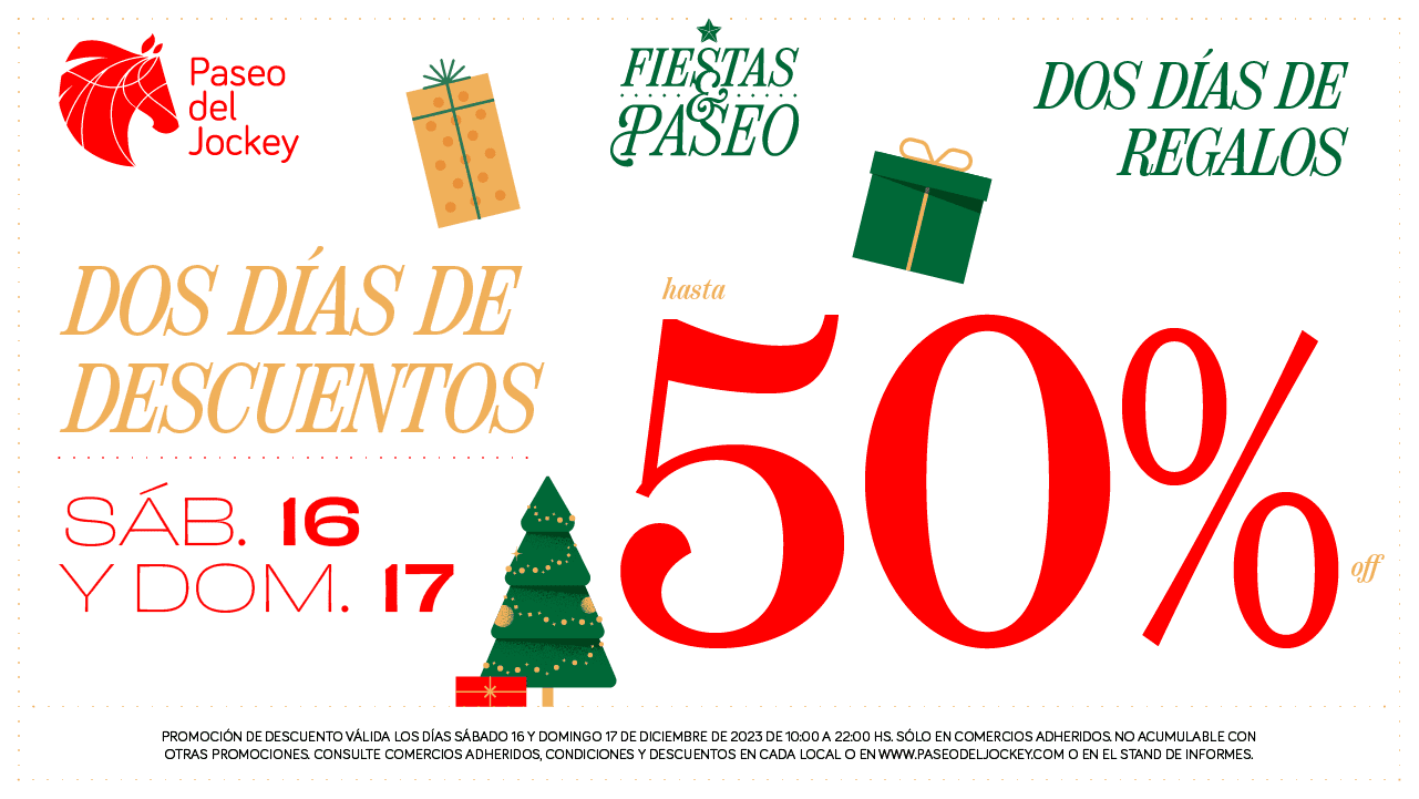 El sábado 16 y el domingo 17 de diciembre, en Paseo del Jockey hay increíbles descuentos de hasta 50% en más de 50 marcas adheridas!