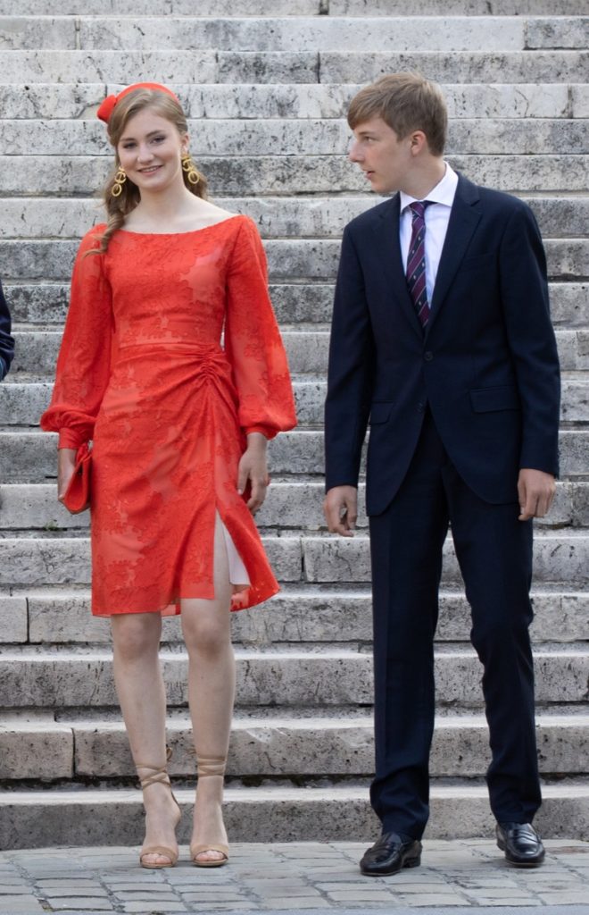 Elisabeth de Bélgica llevó un vestido de color rojo de Natan, una de las marcas favoritas tanto de su madre, la reina Matilde, como de Máxima de Holanda.