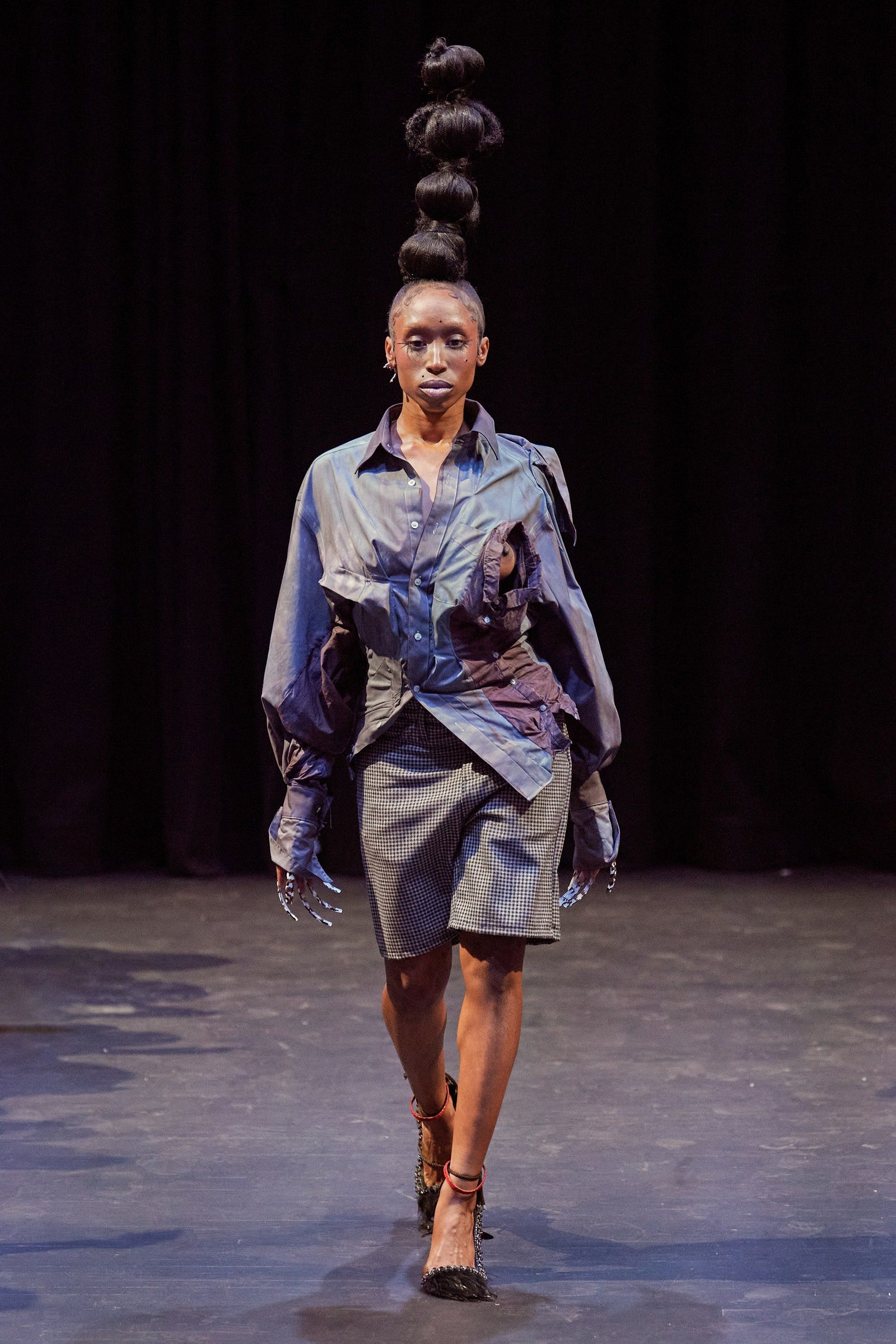 Hacia el final de la semana, el cabello natural alcanzó nuevas cotas. En Collina Strada, la modelo Indira Scott lució dos peinados diferentes: recogieron su característica cascada de trenzas en una coleta hasta el techo y llevó un intrincado recogido alto, todo obra de la peluquera Mideyah Parker. Poco después, en No Sesso, la modelo Sade Keinu se contoneó por la pasarela con un escultural recogido vertical que no dejó indiferente a nadie.