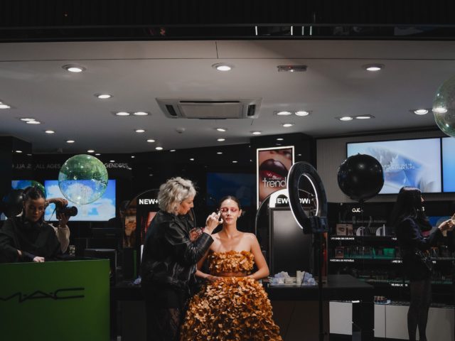 La cantante llevó el pelo en una media cola pulida con ondas voluminosas en sombras en tonos nude y cat eye negro pronunciado.