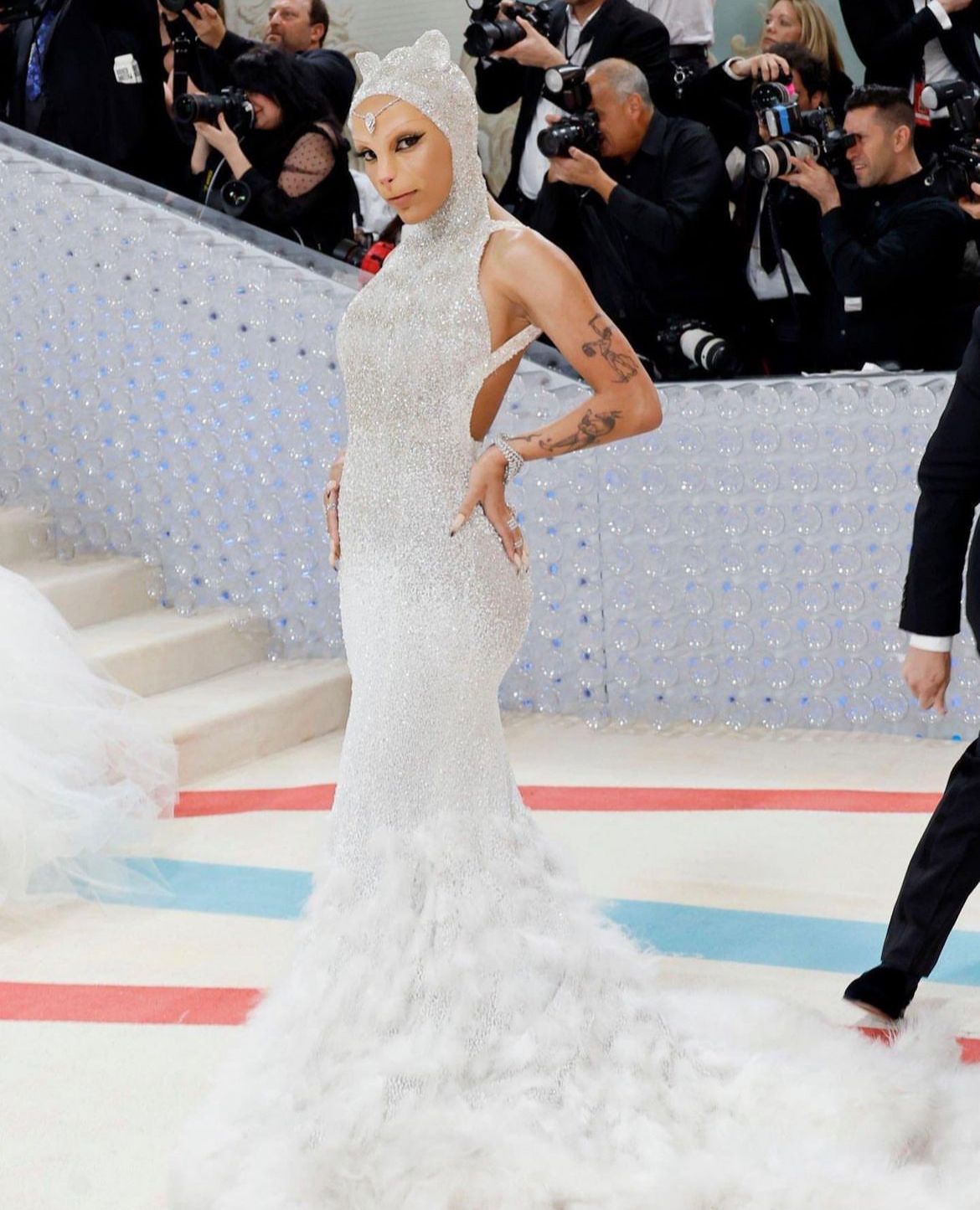 Mientras que Rihanna en Valentino blanco, Jenna Ortega con look romántico digno de Karl, Cardi B, Stella McCartney, Bradley Cooper, Priyanka Chopra Jonas y Nick Jonas, Anne Hathaway, Doja Cat en Oscar de la Renta, Billie Eilish, Jessica Chastain en Gucci, Vanessa Hudgens, Gisele Bundchen en Chanel SS07 Couture, Sydney Sweeney en Miu Miu, Margot Robbie en Chanel, Lily CollinsKristen Stewart, Emily Blunt, Dua Lipa en Chanel FW92 Couture, Nicole Kidman en Chanel, Sienna Miller, Kim Kardashian, Jared Leto quien rindió homenaje a Choupette, la famosa mascota de Karl Lagerfeld, con un look completamente disfrazado de gato, Naomi Campbell y muchísimas estrellas más brillaron haciendo homenaje al legendario diseñador.