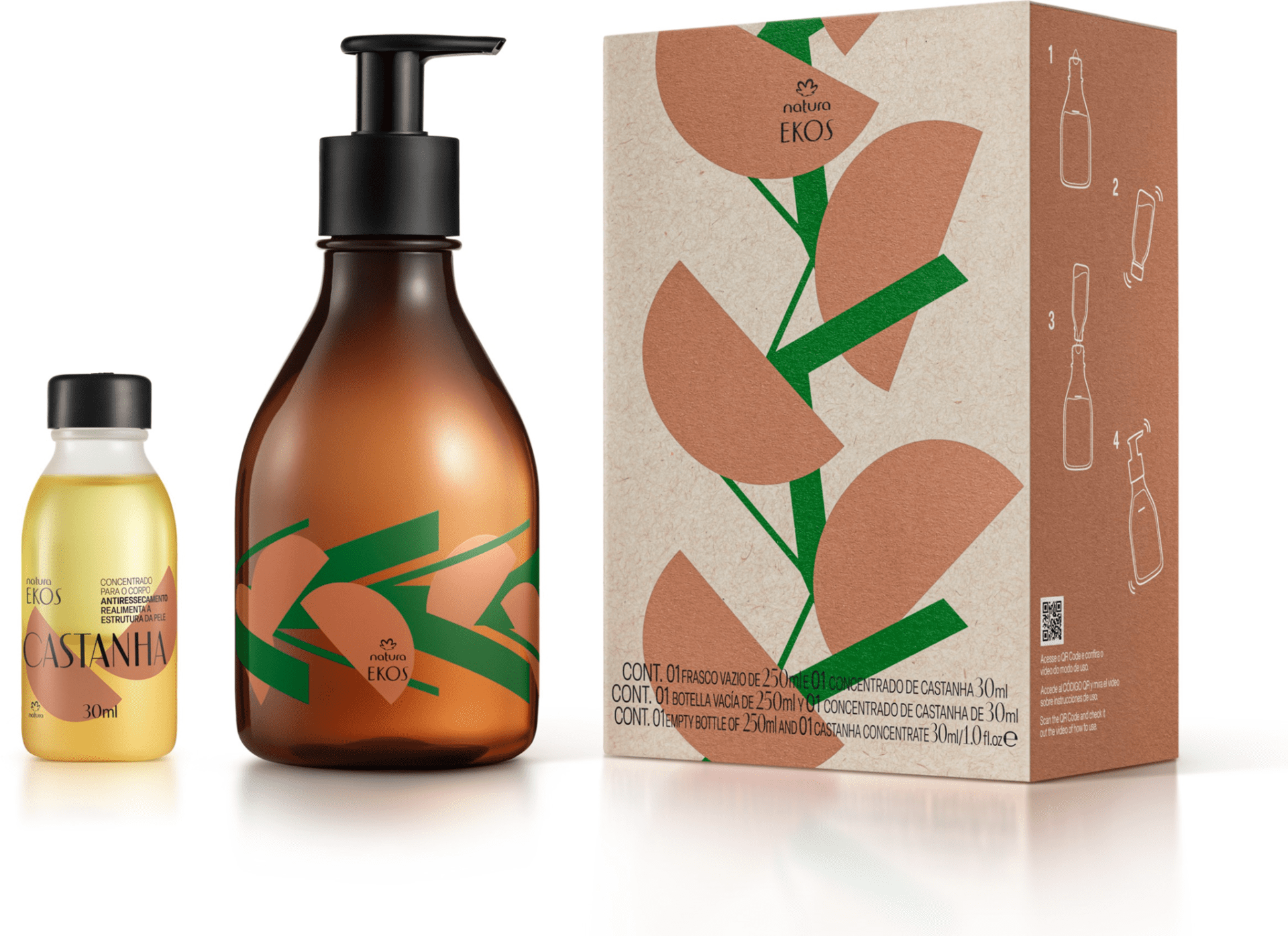 Natura Ekos Hidratante Concentrado de Castaña es el primer concentrado hidratante del mundo, diseñado para transformar agua en una potente crema corporal de castaña. Ofrece más potencia para fortalecer y reparar la piel, con menos plástico en el planeta. Tiene un envase fabricado con un 81% menos de plástico que el repuesto regular y su frasco está fabricado 100% con plástico reciclado.