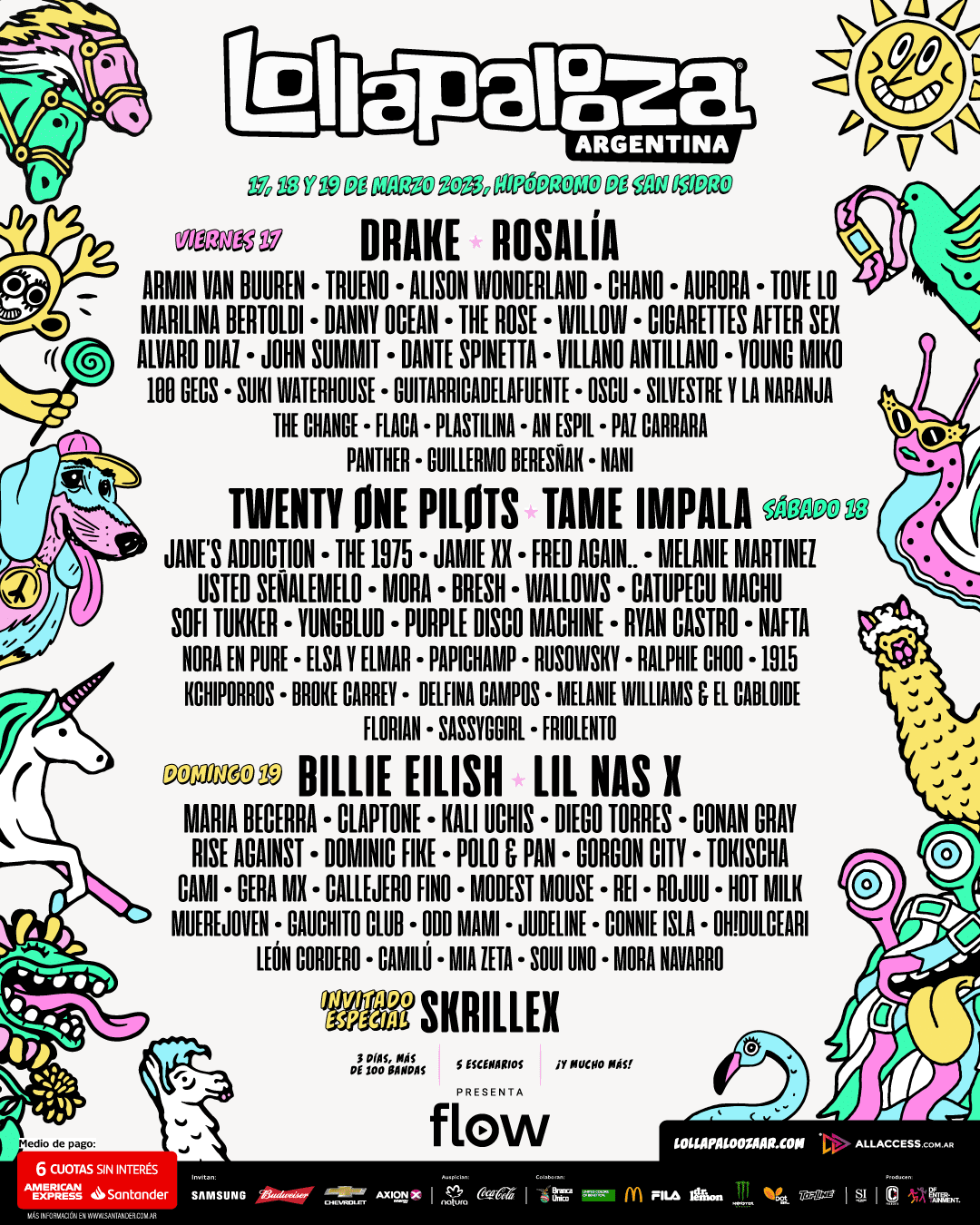 Se completa así una grilla histórica y repleta de artistas que harán su debut en suelo argentino como Billie Eilish, Drake, y Lil Nas X, gigantes de la música actual como Rosalía, The 1975, Jamie XX, Kali Uchis, así como músicos que representan lo mejor de la música argentina, con María Becerra, Trueno, Usted Señalemelo, Diego Torres, Chano, Marilina Bertoldi, ¡entre muchísimos otros! Una vez más, Lollapalooza convertirá el Hipódromo de San Isidro en una meca musical para todos los gustos durante todo un fin de semana: allí convergirán melómanos de todas partes del país y visitantes que vendrán para la ocasión entre el 17 y el 19 de marzo.