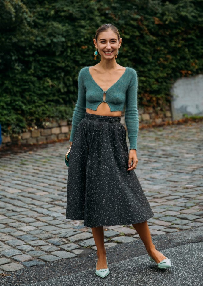 De la versatilidad de las faldas midi ya se ha hablado largo y tendido, pero he aquí una muestra más de cómo pueden ir de lo urbano a lo retro dependiendo de hechuras y tejidos que la conformen. Pero el cárdigan tampoco se queda atrás: aunque suele estar asociado a estilismos más clásicos, también puede acercarse a lo sexy, como sucede con el de Jacquemus que lleva Jenny Walton en esta imagen.