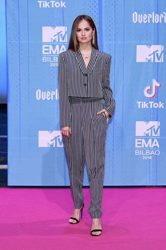 Debbie Ryan, utilizó para la gala un traje a rayas de Dzojchen.