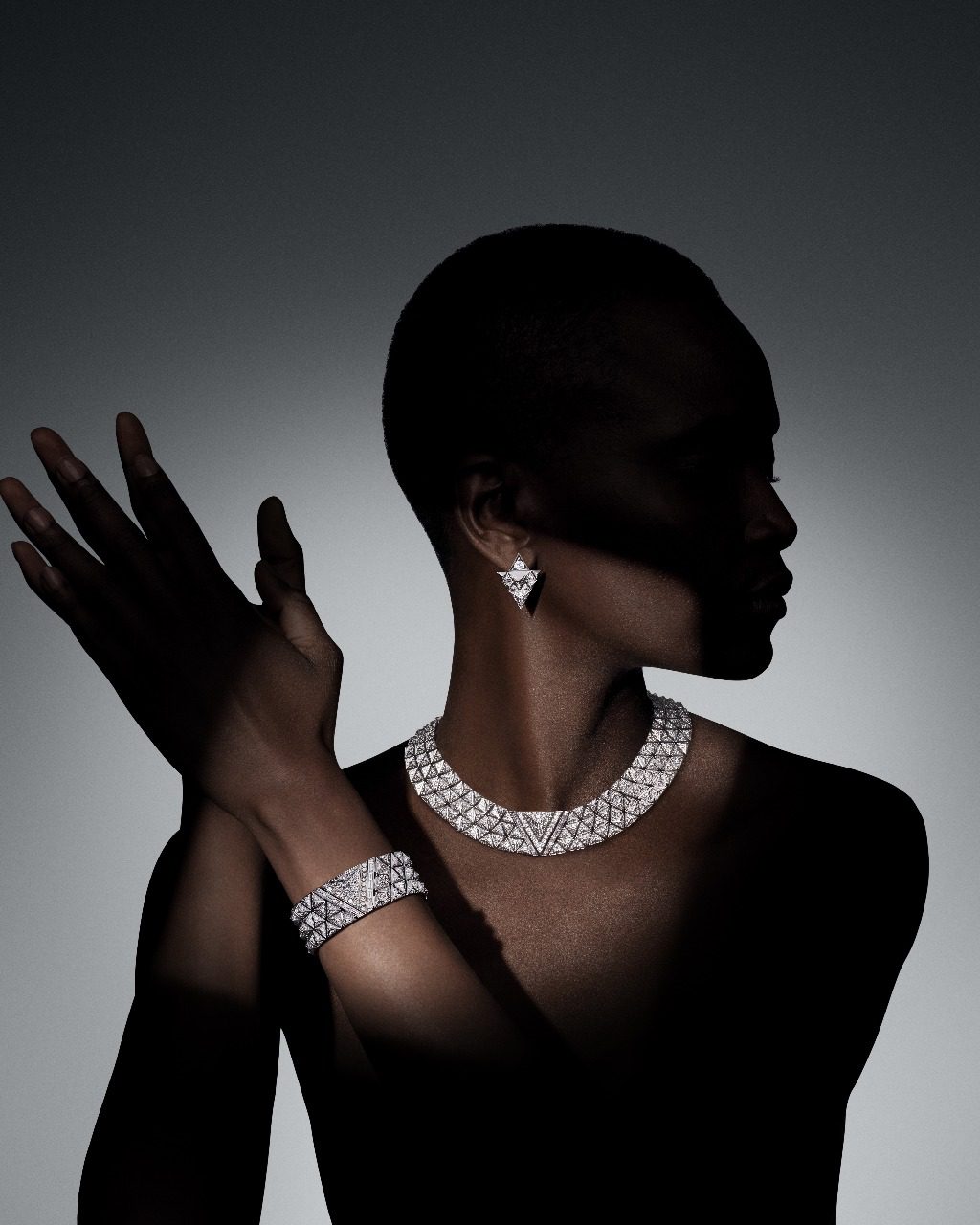 En un collar y una pulsera, las pirámides del icónico motivo dirigen la mirada hacia un ornamento central en forma de V, cuyo poder de atracción se ve realzado por el uso de diamantes talla baguette.