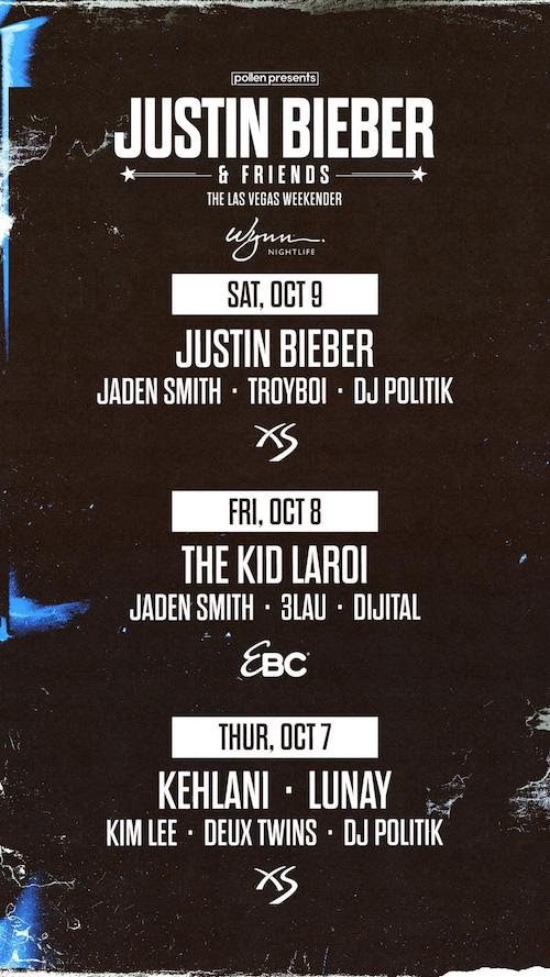 Este evento producido por Pollen será un evento único en su tipo planeado por Bieber en Las Vegas del 7 al 10 de octubre, con un itinerario lleno de sus actividades favoritas e invitados musicales seleccionados por la gran estrella. La experiencia tendrá lugar durante tres días y tres noches, con el XS Nightclub de Wynn Las Vegas y el Encore Beach Club como lugares principales.