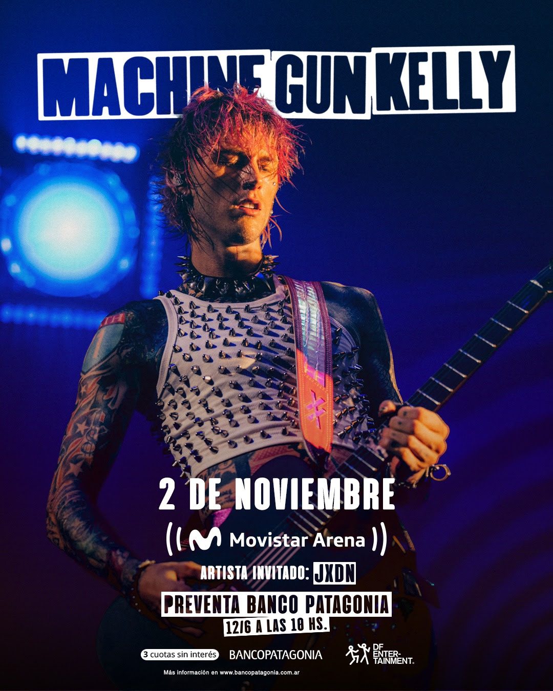 Después de un memorable show en Lollapalooza Argentina 2022 con un setlist lleno de estrenos de mainstream sellout, su sexto y último disco que vio la luz pocos días después, se abrió una nueva etapa en el vínculo de Machine Gun Kelly con sus fans argentinos. Es que el músico estadounidense dio un show contundente, llevando la potencia de su música a otro nivel, algo que acostumbra en todas sus enérgicas presentaciones en vivo, donde tira barras a la velocidad del arma –”machine gun” es ametralladora– que eligió como nombre artístico. El 2 de noviembre MGK se estará presentando por primera vez con un show en solitario en el país, en el estadio Movistar Arena, con producción de DF Entertainment. Las entradas se podrán adquirir únicamente a través de Movistar Arena, primero en la preventa exclusiva para clientes Banco Patagonia (por 48 hs o hasta agotar stock, lo que suceda primero), a partir del lunes 12 de junio a las 10 am. Luego, se dará paso a la venta general. En ambas instancias, los clientes Patagonia contarán con el beneficio de 3 cuotas sin interés.