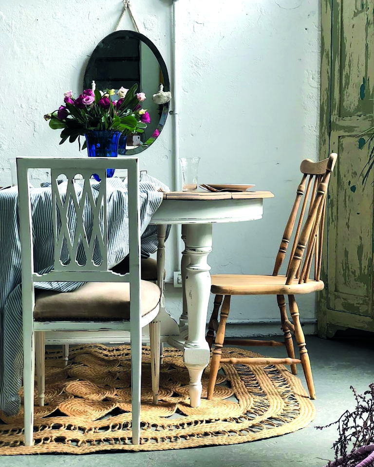 Lo vintage es su marca personal. Mesas desgastadas, herrajes, sillas ribeteadas y una araña de techo son los protagonistas de su comedor diario. La mixtura viene de la mano de unas modernas sillas giratorias que aportan comodidad y refuerzan el tono blanco.