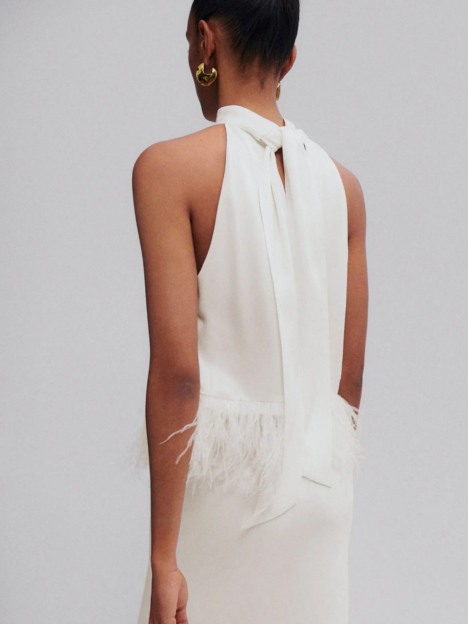 Se trata de un conjunto de dos piezas compuesto por una falda larga de satén con caída asimétrica y un top en el mismo tejido, con cuello halter y decorado con plumas. Un total look que incorpora algunas de las tendencias más aclamadas de la temporada -desde el acabado satinado hasta el detalle de las plumas- adaptándolas a un estilismo nupcial tan fresco como elegante.