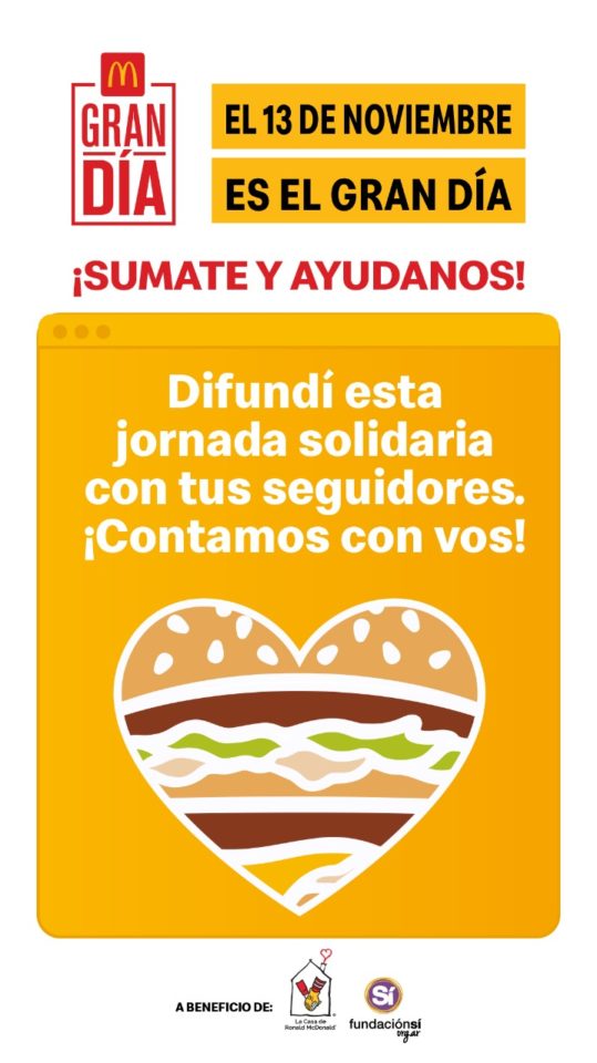 El Gran Día es una jornada muy especial para nosotros como compañía, ya que todos los locales y empleados se unen con el objetivo de ayudar a quienes más lo necesitan. En este contexto tan difícil entendimos que era el momento de ayudar a quienes lo necesitan. Necesitamos el apoyo y la solidaridad de todos los argentinos para ayudar a Casa Ronald y Fundación Sí, dos organizaciones que representan la ayuda a los niños y sus familias, y la búsqueda de oportunidades para los más jóvenes, causas que se encuentran arraigadas en el corazón de nuestra compañía”, anunció Guillermo Córdoba, Director General de McDonald’s en Argentina.