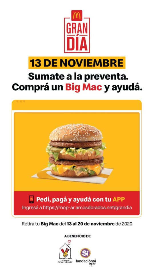McDonald’s llevará a cabo una nueva edición del Gran Día, su jornada solidaria donde el 100% de lo recaudado por la venta de su hamburguesa Big Mac en todo el país será donado a Fundación Sí y a la Casa Ronald. La compañía presenta una propuesta de compra anticipada del famoso sándwich en un formato digital a través de su App para que todos puedan tener la oportunidad de colaborar desde donde estén y enviar la hamburguesa a través de un código que se puede redimir en cualquier local de la marca del 13 al 20 de noviembre.
