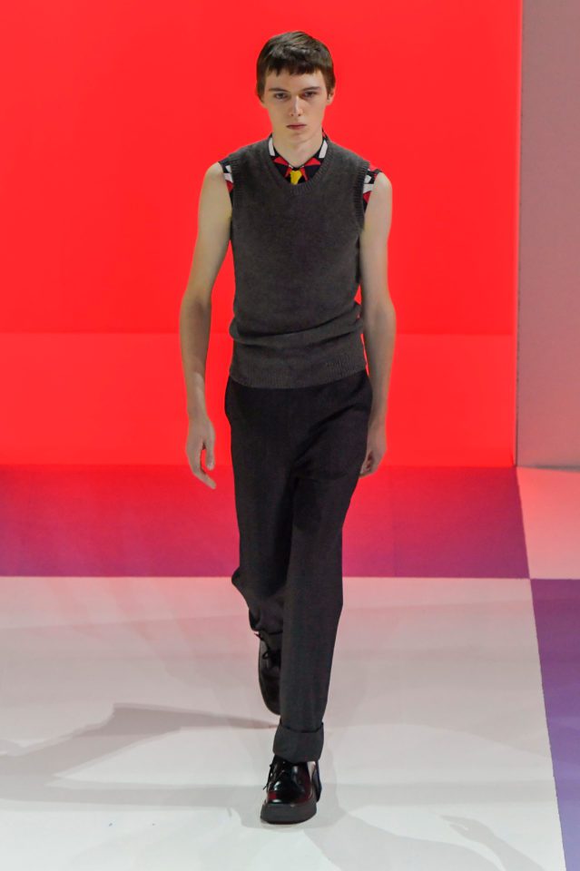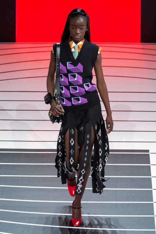 PRADA: Esta colección está inspirada en el «valor» en un momento de desorden mundano. Con diseños cuadrados, colores apagados, geometrías y mucho jersey. La firma presentó una moda surrealista y glamurosa. «La referencia principal de esta colección es esa época formidable de la Secesión vienesa donde intelectuales, artistas, obreros y artesanos trabajan juntos para crear algo nuevo»- afirmó Miuccia Prada.