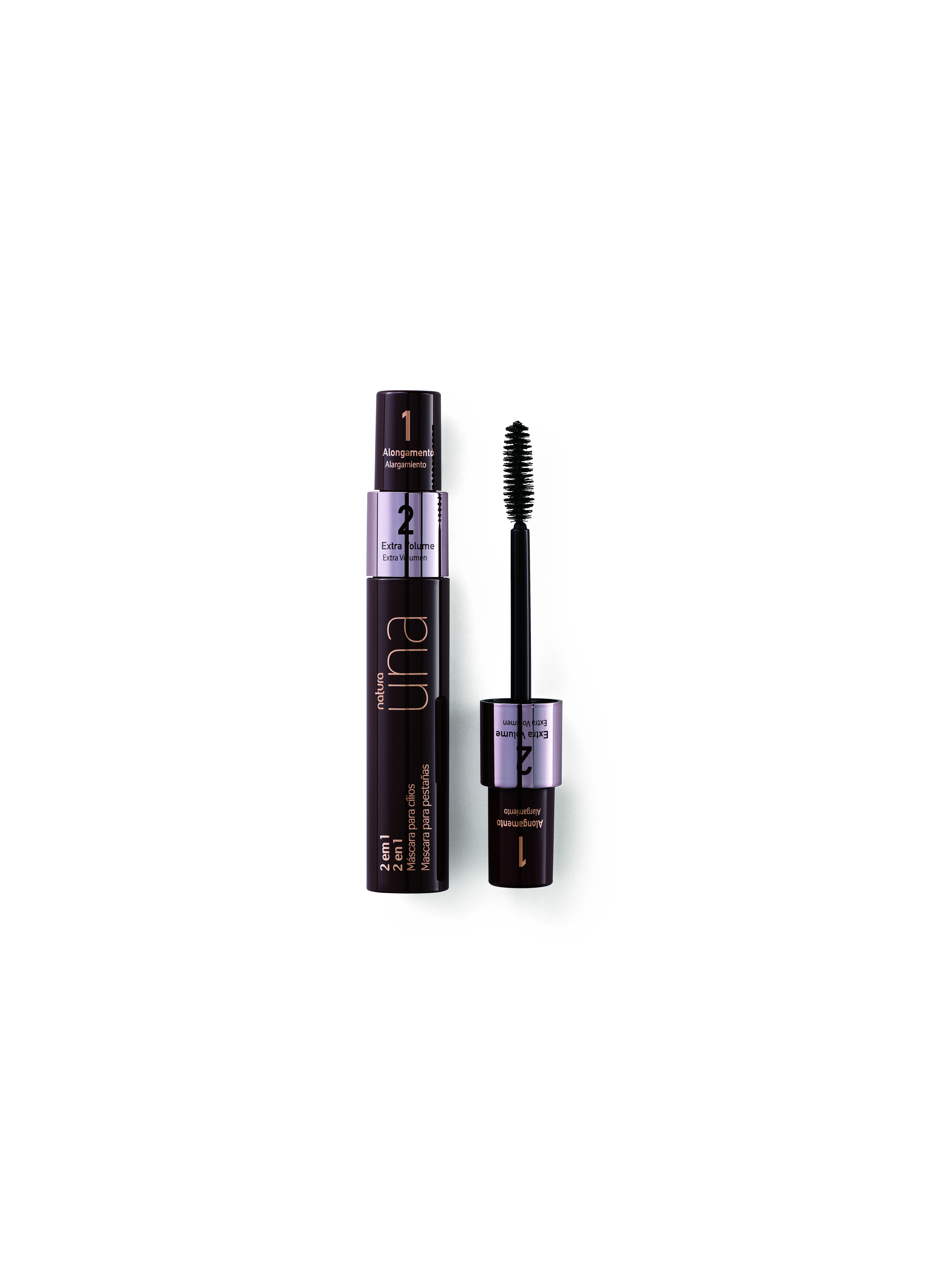 Pestañas y cejas: Aplicamos la Máscara 2 en 1 para lograr pestañas con volumen y alargamiento intenso. Posteriormente, utilizamos suavemente el Delineador para cejas, siguiendo la dirección y peinado de las hebras.