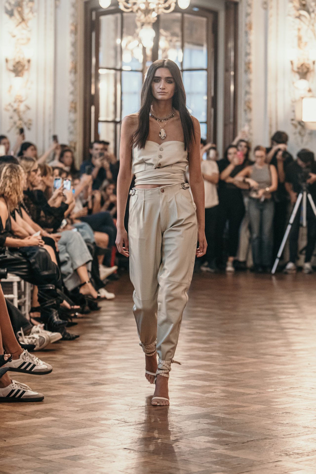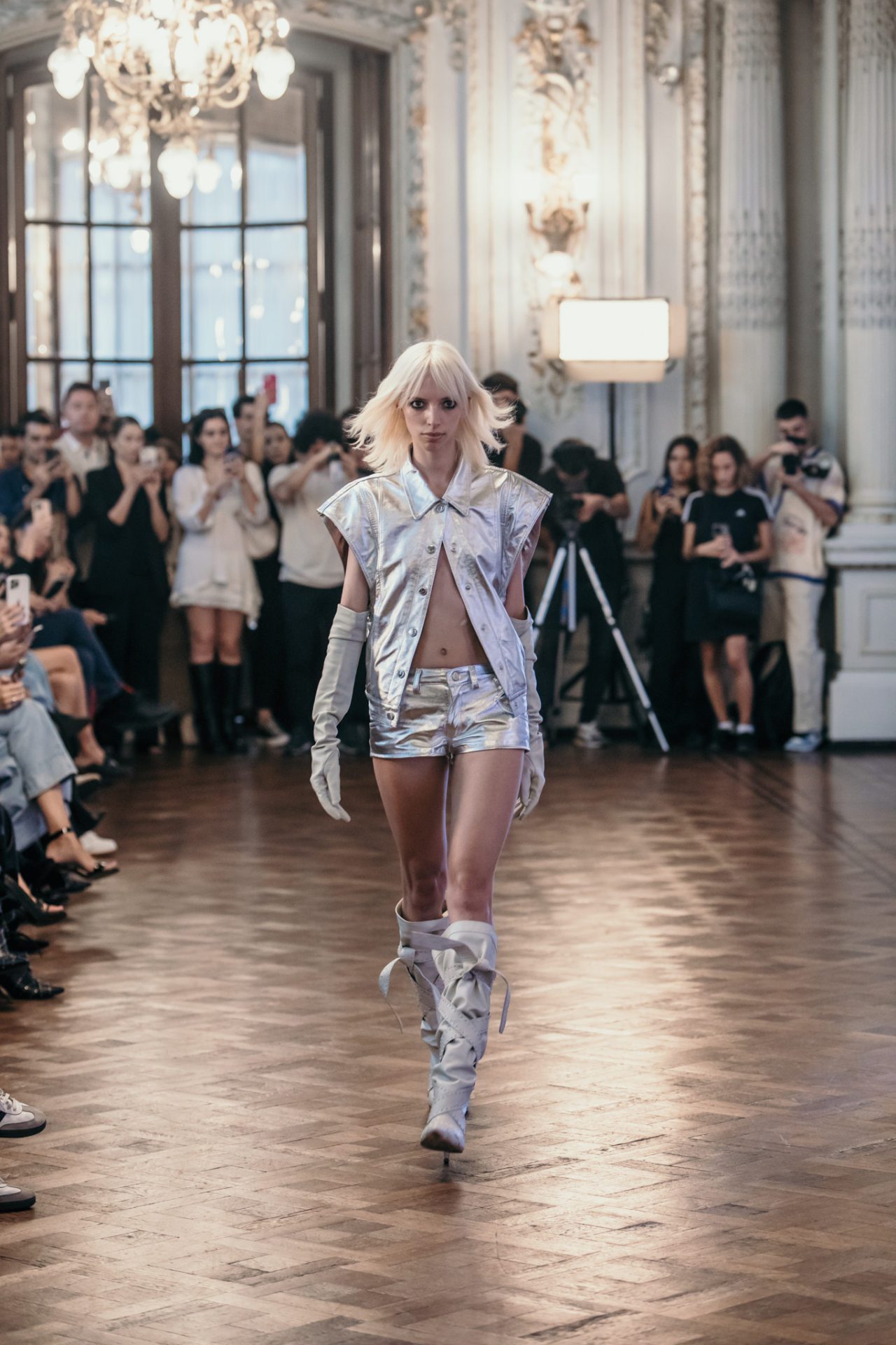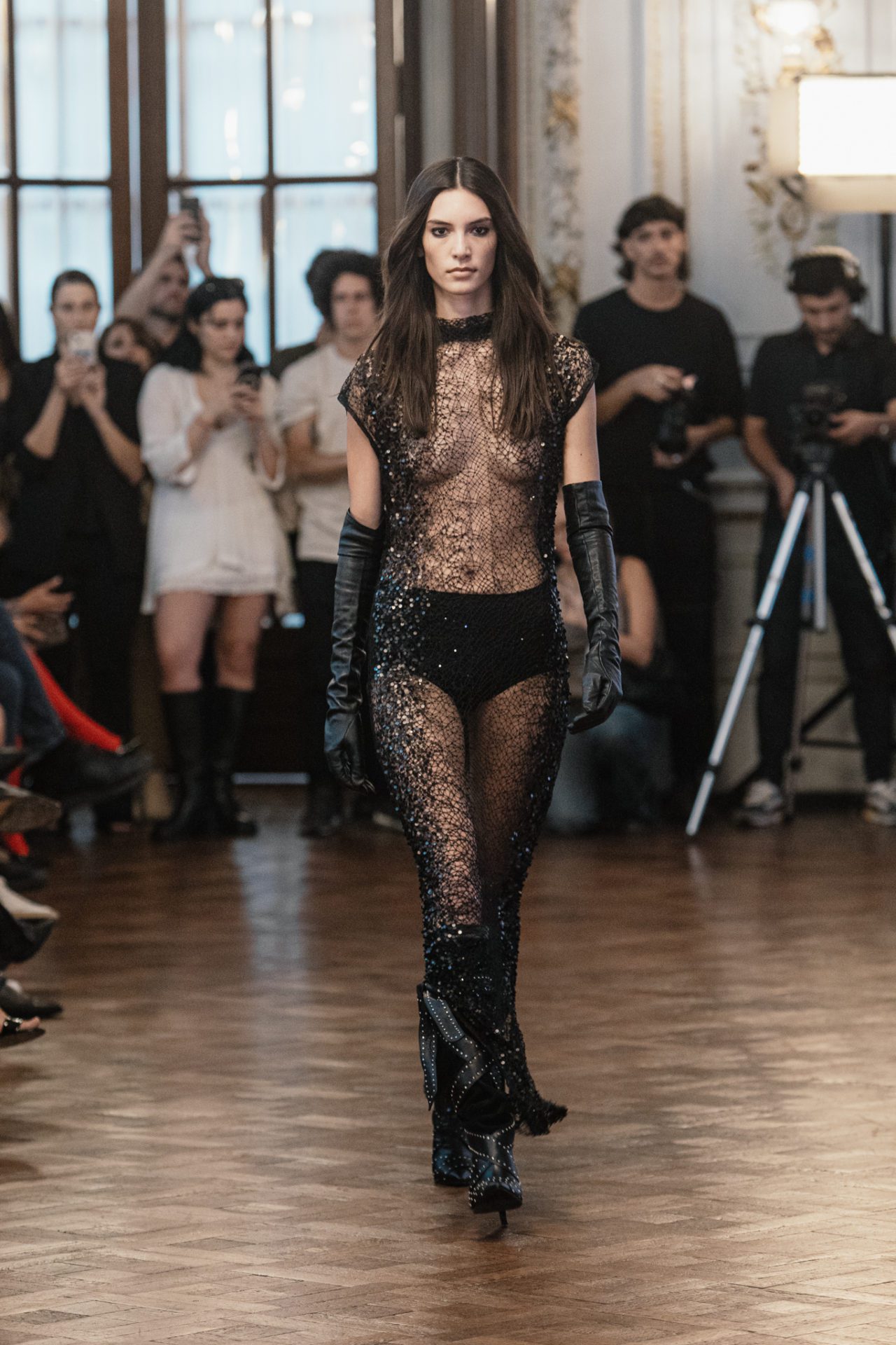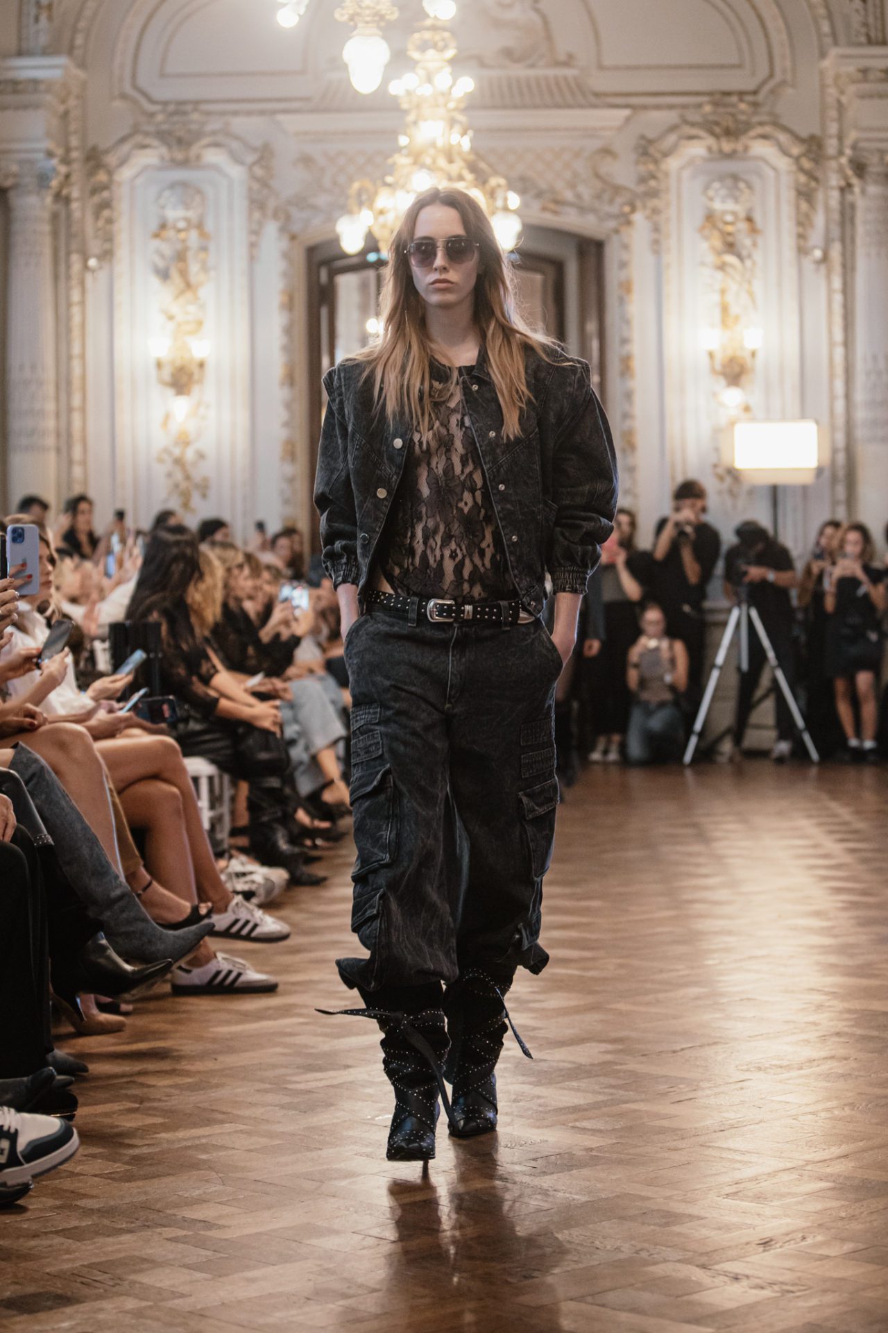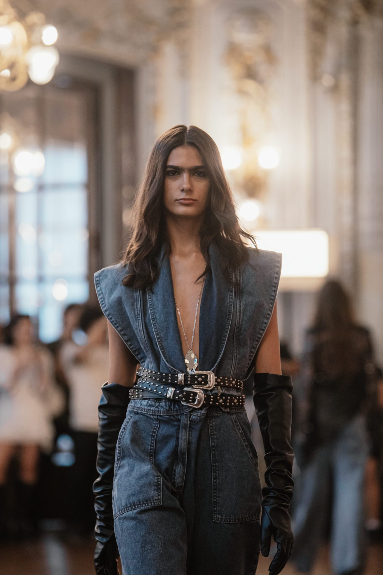 La colección tuvo gran presencia de brillos y transparencias, además de los jeans y camisas con estructura de alta costura característicos de la marca. Lo más destacado fueron los looks de noche metalizados.