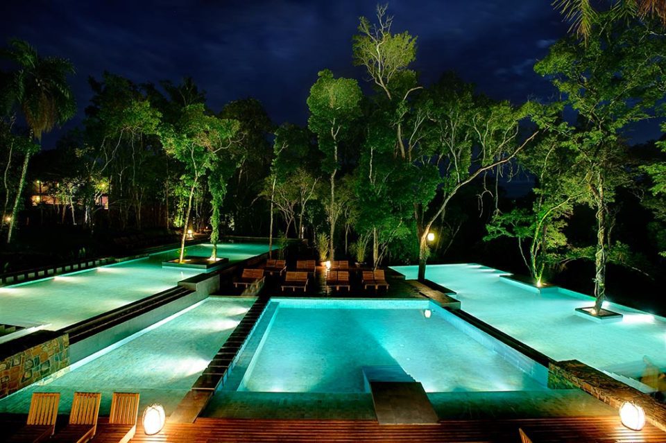 -Las piscinas exteriores, escalonadas y rodeadas de grandes árboles nativos.