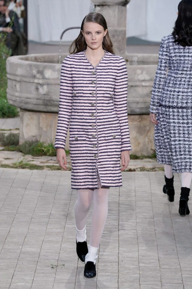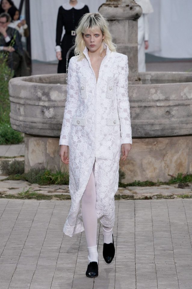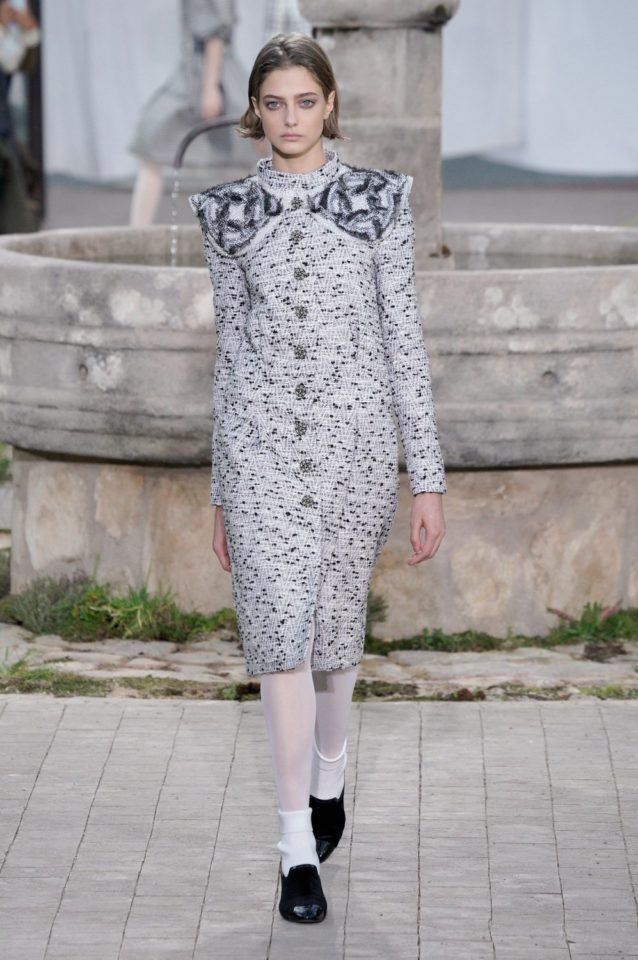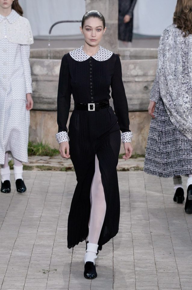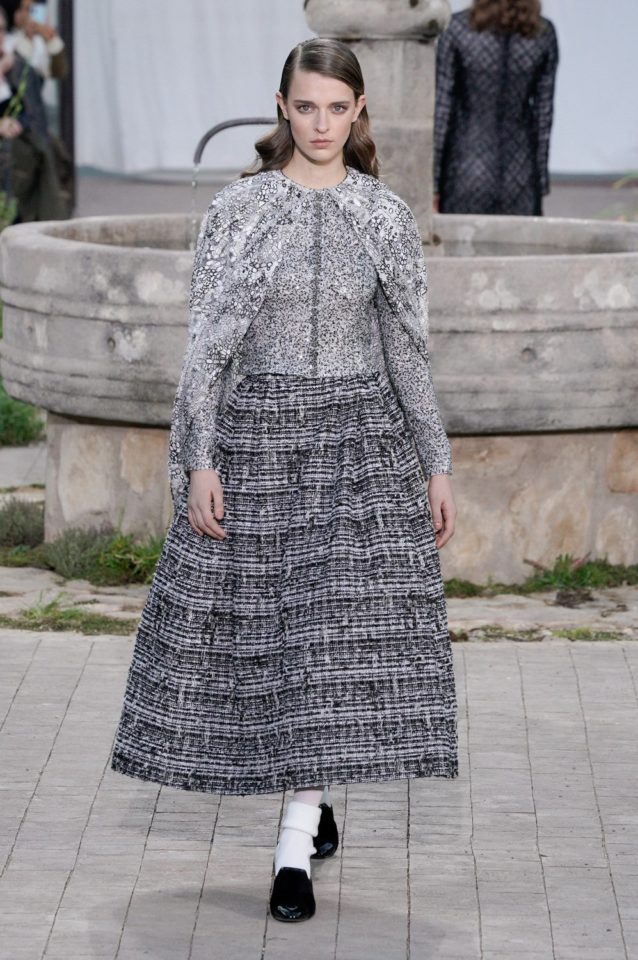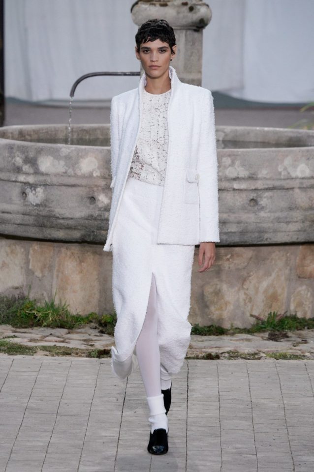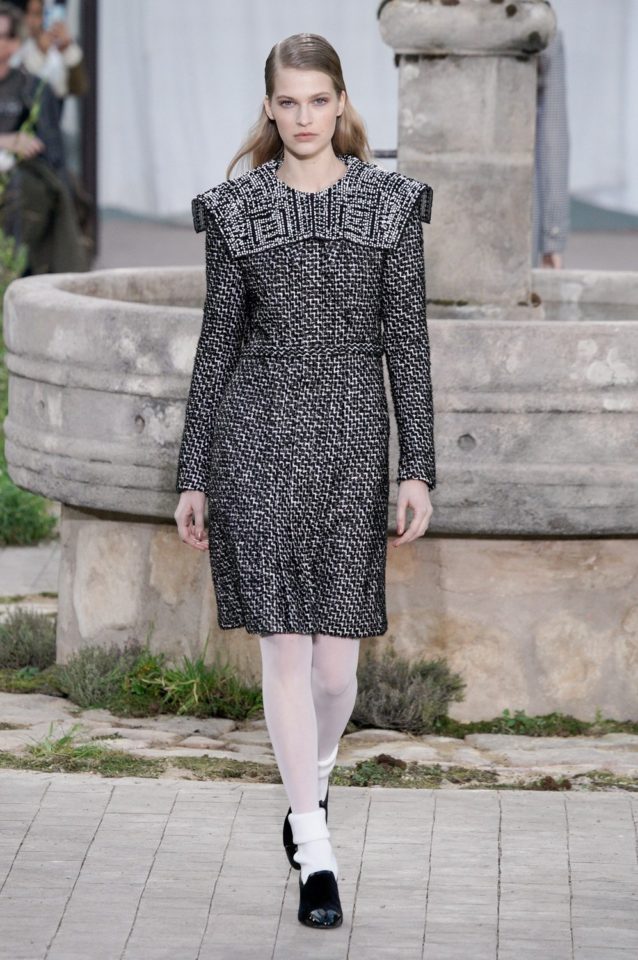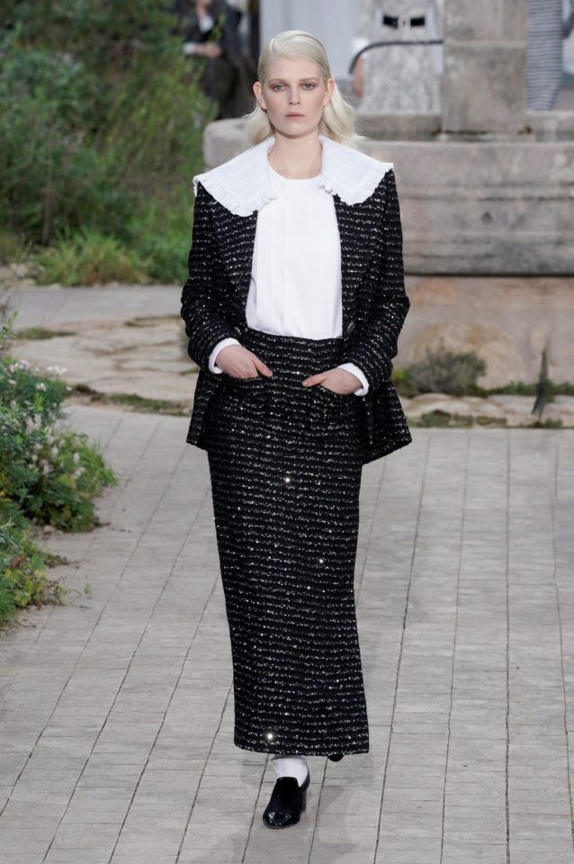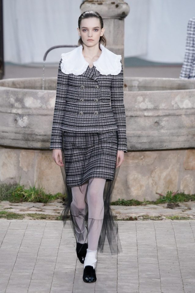 Chanel: Con una recreación del orfanato donde se crío Coco, una metáfora que busca mostrar las raíces de la casa francesa. La abadía de Aubazine, un lugar donde predomina la estética colegial. Una colección de Virginie Viard. Faldas por las rodillas, cuello baby doll, tablas, monocromía en blanco y negro, encaje, mocasines y los infaltables calcetines medios caídos.