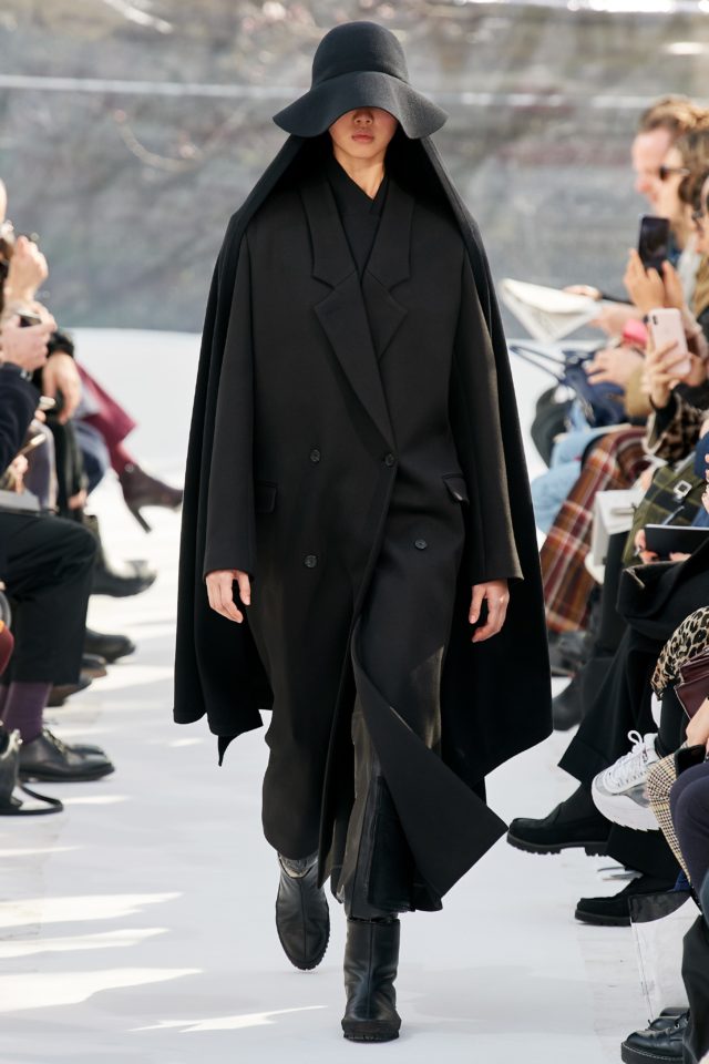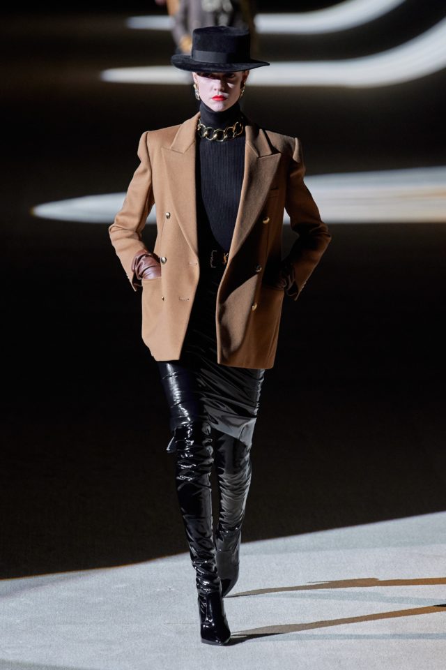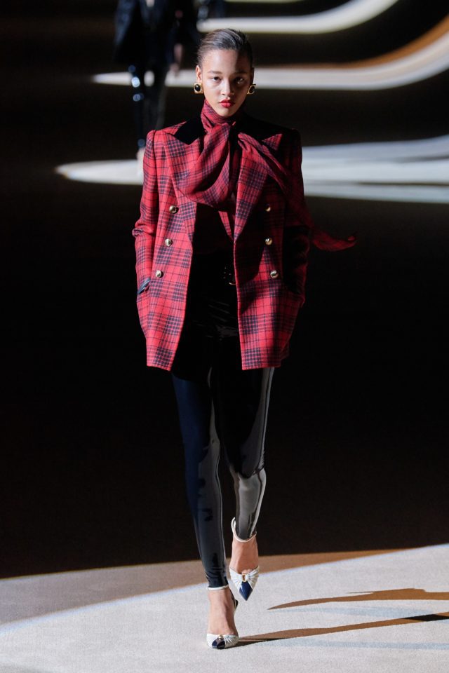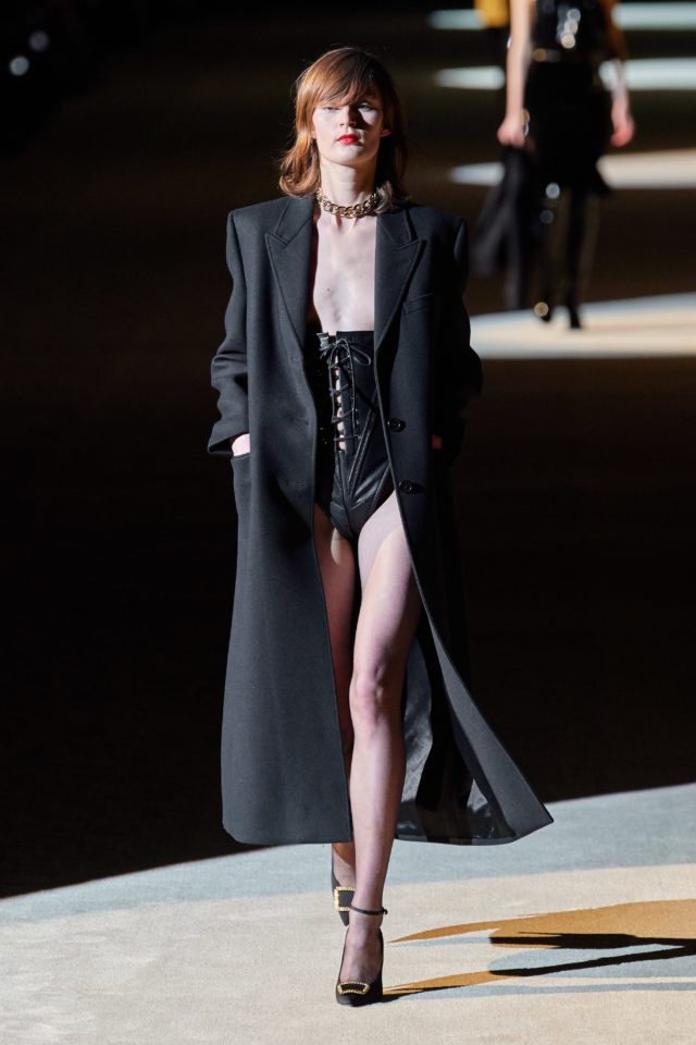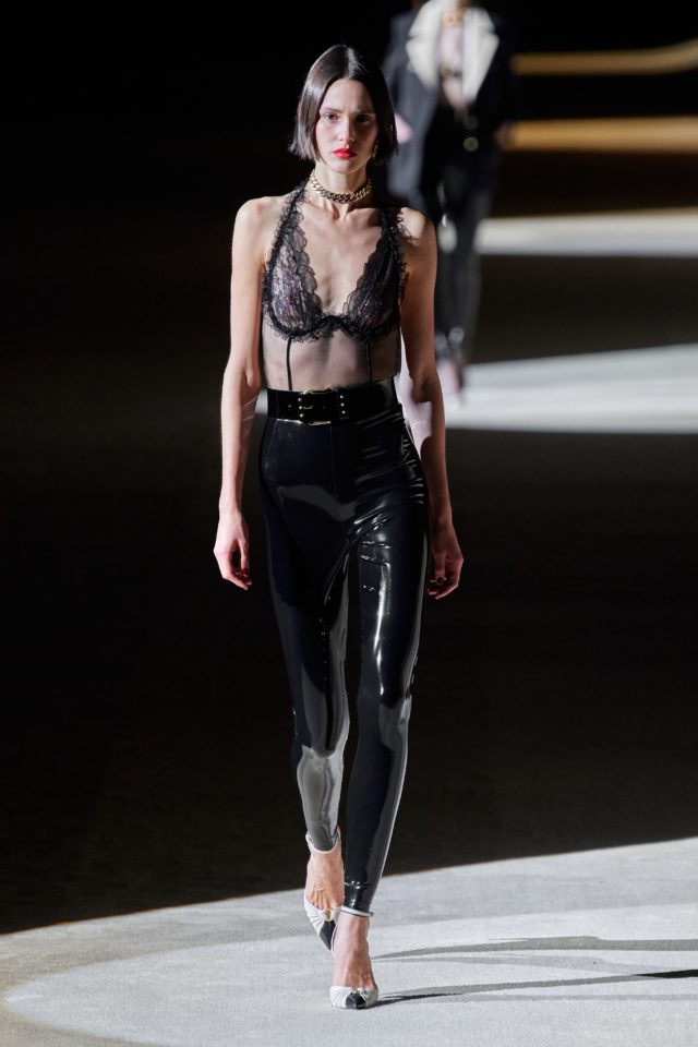 Yves Saint Laurent: La idea creativa al mando de Anthony Vaccarello. 66 fueron los looks que caminaron por la pasarela; desde tops con transparencias, franela gris perlada, lana azul, faldas de lápiz estrictas, pantalones tipo leggings hasta prendas en lurex y vinilo. «Todo es cuestión de tensión entre disciplina y placer» – expresaron desde el programa.
