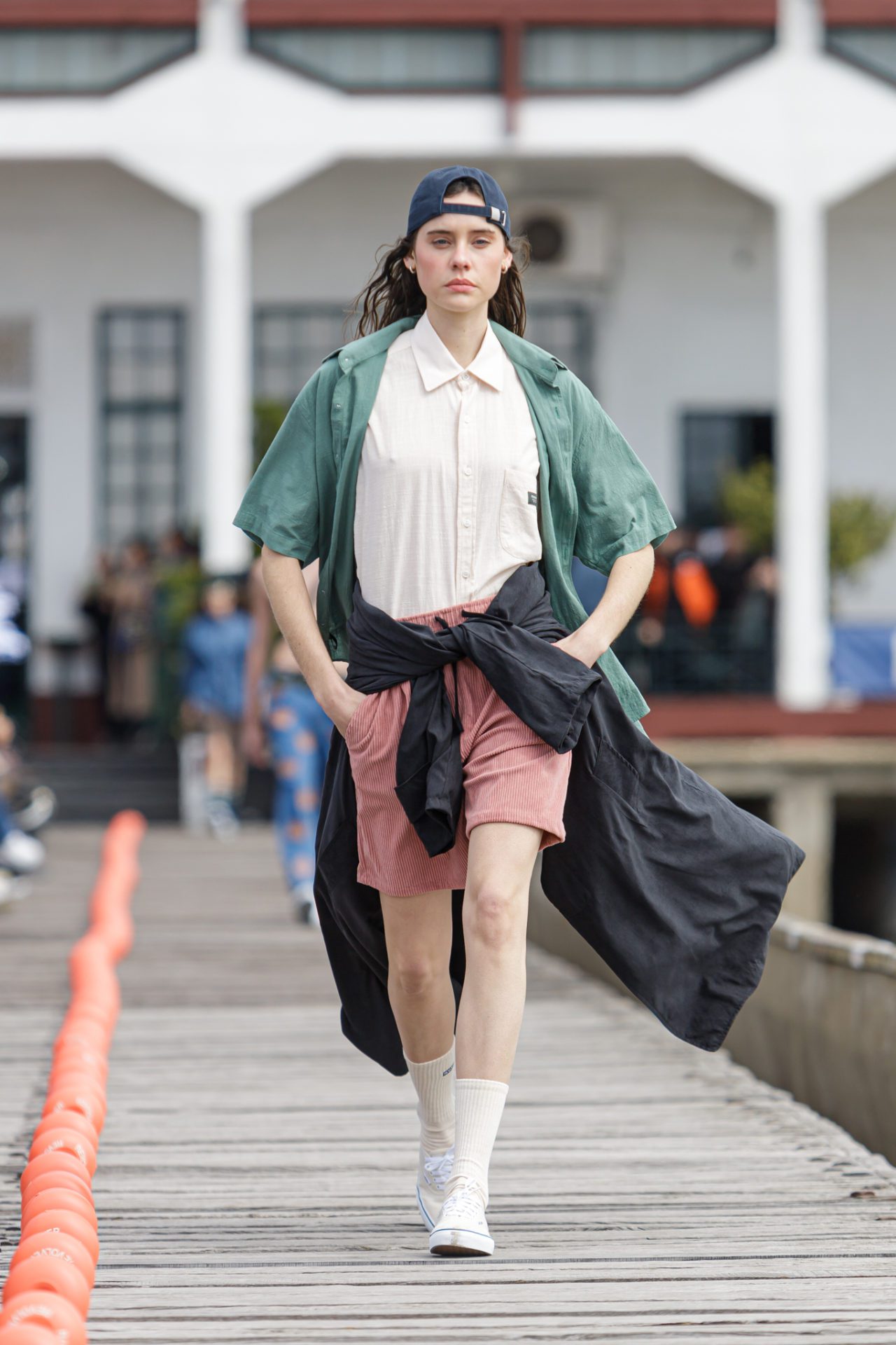 Este pensamiento constructivo vincular guiado en la conceptualización y sistematización se acompaña a través de prendas icónicas elaboradas desde una perspectiva acuática como componente disparador, trabajando elementos comunicacionales que remiten a ríos y océanos. Las prendas se construyeron en materiales como el mesh, cotton nylon, con procesos como repelentes al agua, prendas regulables, desmontables, adaptables y de alta durabilidad que remiten directamente a la situación acampe, exterior, donde conectamos la situación mallas de pesca, mosquiteros, portable y funcional.