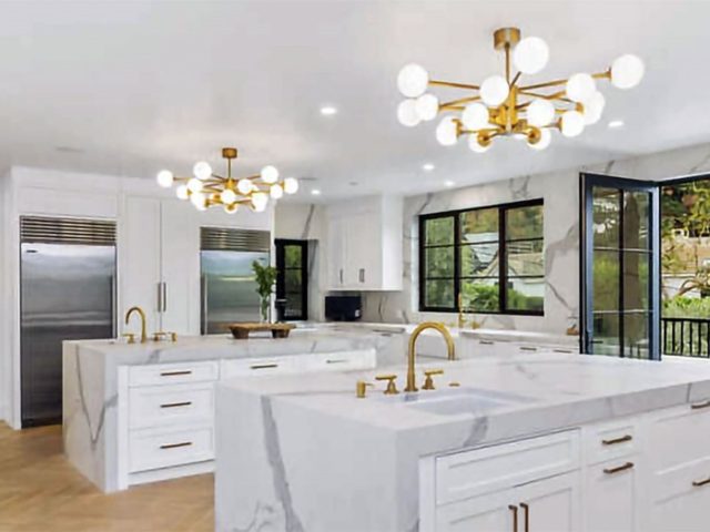 Siguiendo con el recorrido, nos encontramos con uno de los sectores privilegiados de la mansión: la cocina tipo gourmet. Con el mármol blanco como protagonista indiscutido, cuenta con dos islas súper funcionales y griferías doradas que combinan a la perfección con las dos arañas modernas que sobrevuelan el ambiente. Los electrodomésticos de acero inoxidable se encuentran empotrados en la pared y son de primera categoría.