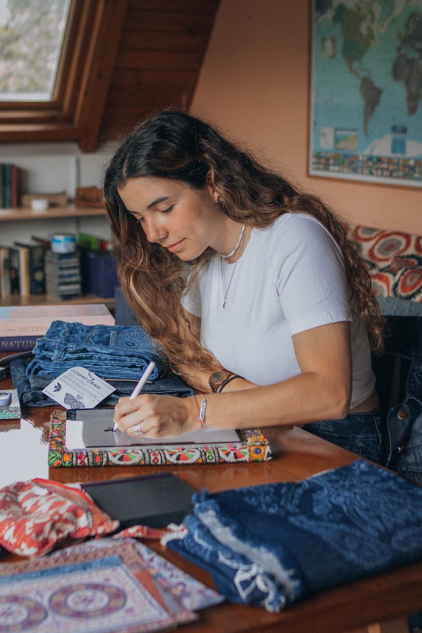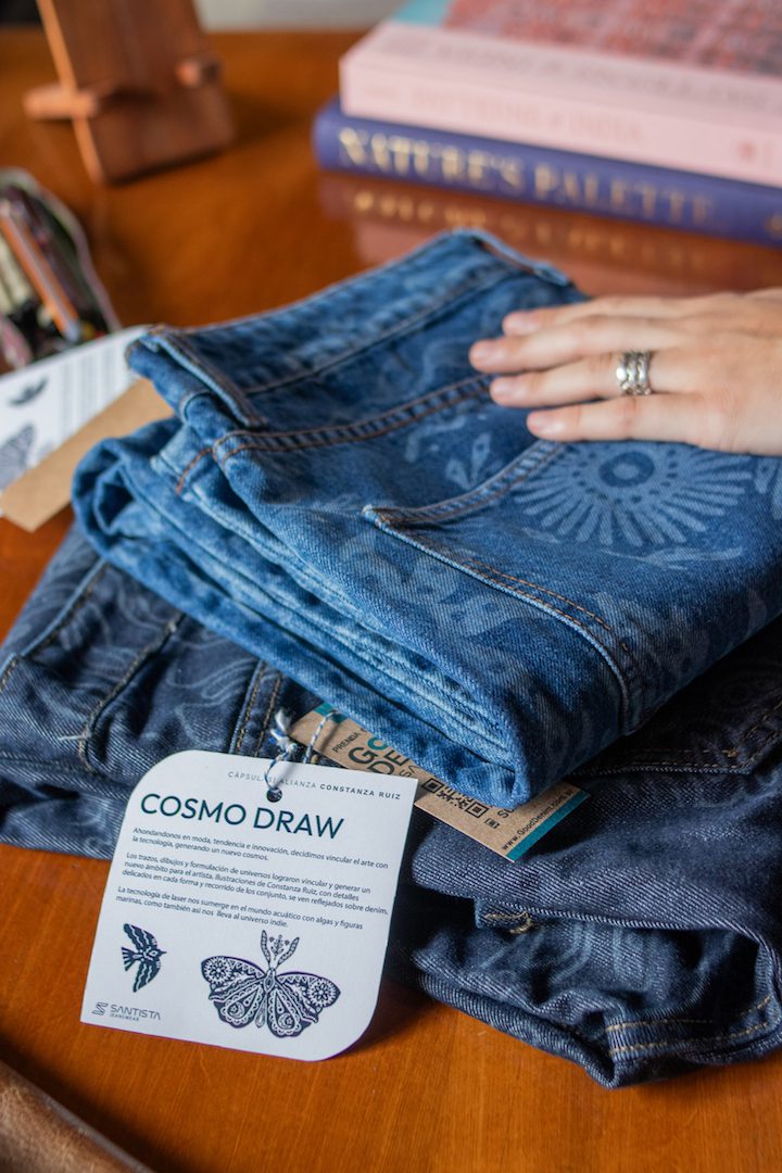 «El proceso de ilustración para Santista JW fue revelador. Empecé a ilustrar para mí misma y luego aplicaba los dibujos a diferentes prendas, especialmente denim. Cuando me preguntaron cuál de las técnicas me gustaría aplicar para el proyecto, encontré el láser como una opción interesante ya que contrastan mis trabajos con el jean, utilizando colores afines como el azul y el blanco. Ver mi esfuerzo plasmado en el tejido de Santista fue una experiencia única, el paso de la pantalla a la realidad es hermoso», comenta la artista Constanza Ruiz.