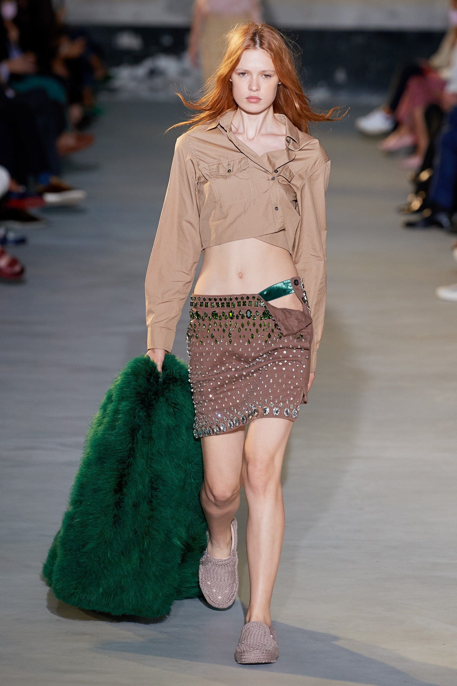 En medio de las transparencias, de los cut-outs e incluso del regreso de la estética fetichista, el cuerpo vuelve a exhibirse tras unos años en el que la máxima fue el recato absoluto (y si no, recordemos los vestidos a lo Amish de 2018). Este progresivo ‘destape’ dio un primer paso poniendo el sujetador a la vista en el centro de todas las colecciones. Pero en 2022 la parte del cuerpo femenino más sexy no incide tanto en el pecho como en anteriores temporadas, sino más bien en la cadera. Es lo que tiene en buena parte el regreso a la estética de los 2000: la consolidación del tiro bajo y el revival del bumster de Alexander McQueen no representan la única muestra de que el centro está en esa V abdominal, la que baja hasta la zona púbica.
