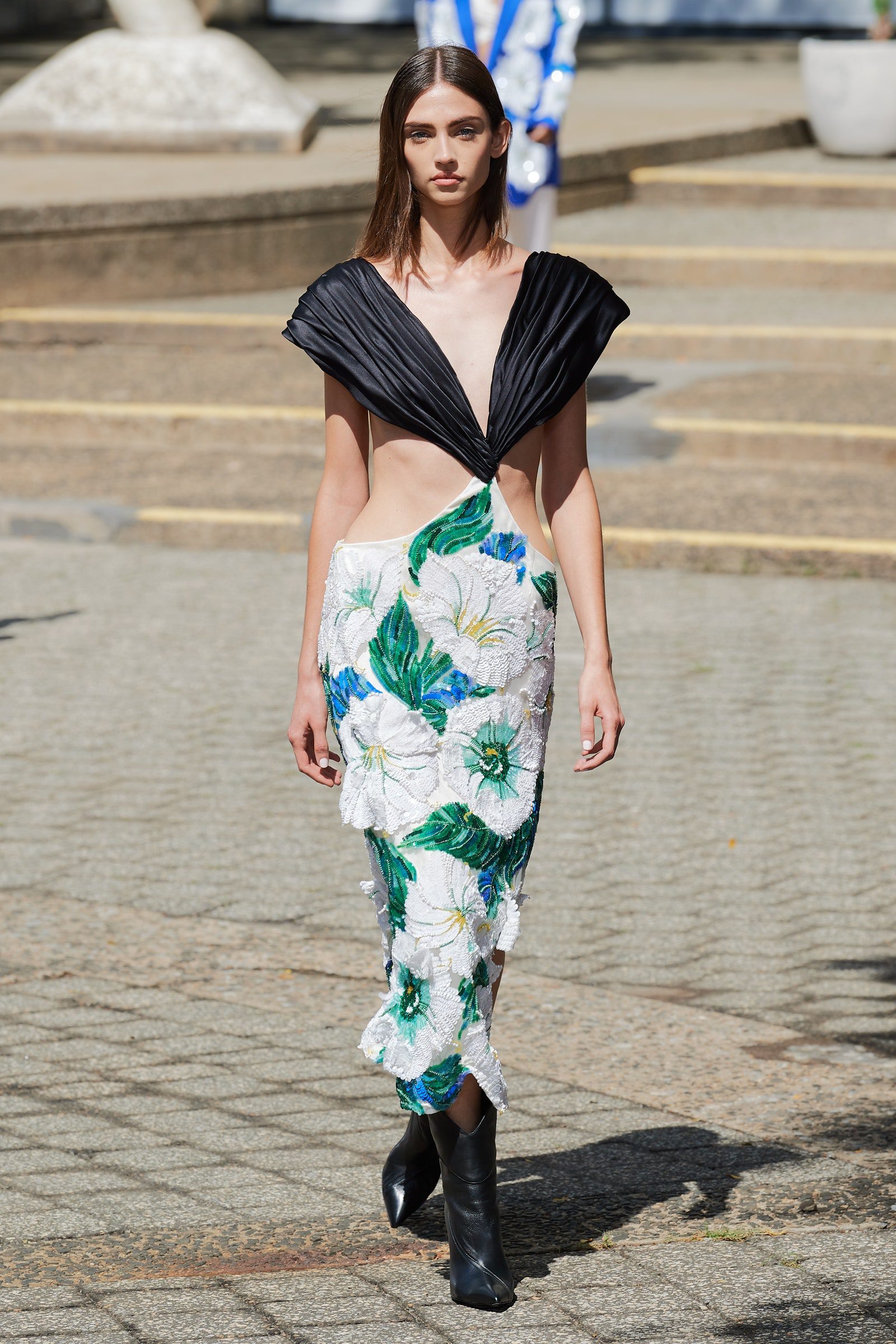 De alguna manera, los cut-outs tan profundos que asoman para el año que viene son la promesa de llevar unos vestidos casi faldas que también cumplen con esta máxima. Es por ejemplo el caso de Jonathan Simkhai, que propone algún vestido de punto cuya apertura baja hasta la altura de la cadera y se remata por un cinturón cadena. En Rodarte se cumple gracias a un vestido de flores XL cuyas aperturas asimétricas bajan la cintura de la falda justo hasta esta zona. Que en la mayoría de casos este tipo de falda se combine con tops muy escotados o con sujetadores no hace sino subrayar una temporada que abre la puerta a la desnudez (y por ende, al sexo) tras un periodo de pandemia que ha destacado precisamente por lo contrario.