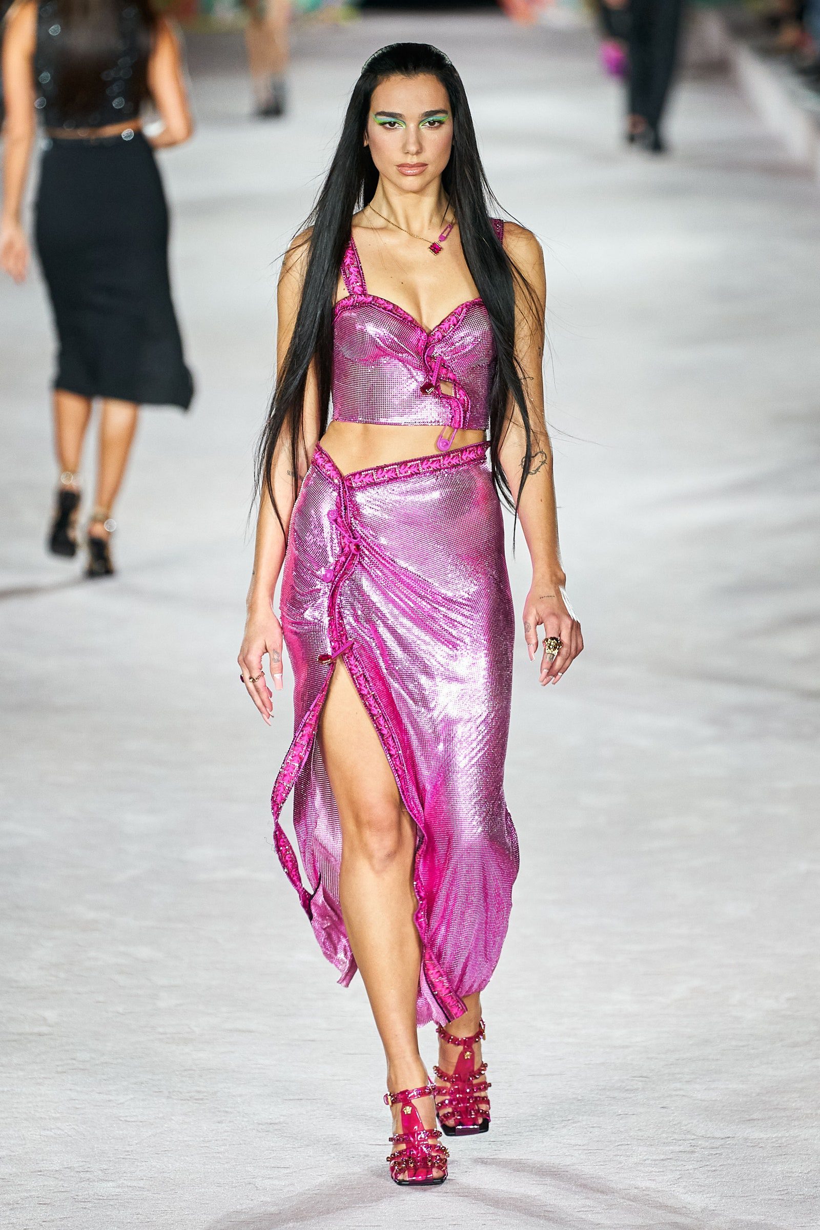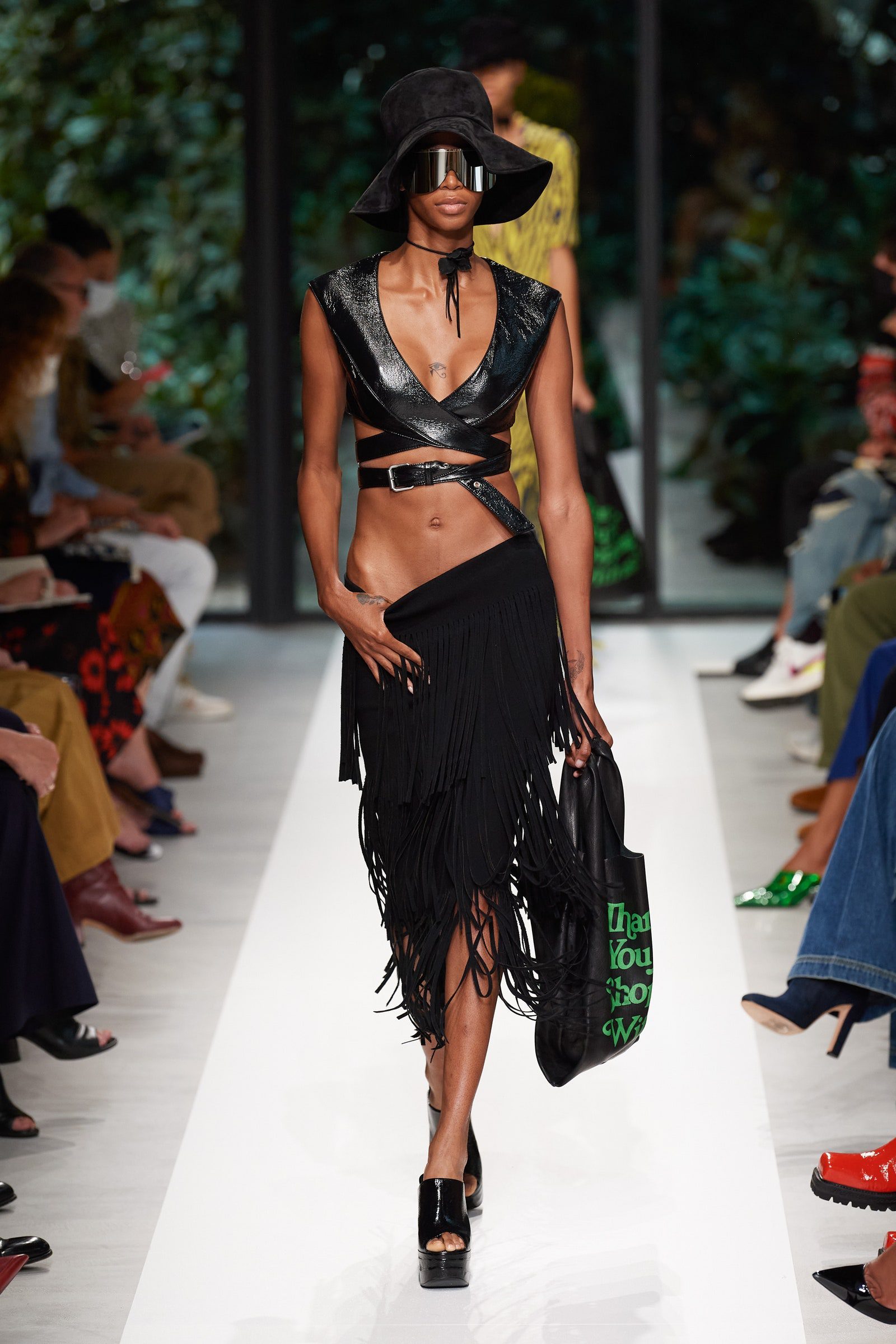 En Versace encontramos una de las firmas ‘reincidentes’: si en la primavera de 2021 la casa italiana apostó por esa polémica falda dosmilera que emulaba un tanga en uno de sus laterales, en la primavera de 2022 repite ejercicio. O al menos, lo emula. En su última propuesta pudimos a ver tanto a Emily Ratajkowski como a Dua Lipa enfundadas en una falda asimétrica cuya cintura se depositaba justo a la altura de la cadera, pero con forma de V. Más vertiginoso era el escote de la falda de flecos de Philosophy, que si bien su bajo llegaba hasta la rodilla, su cintura lo hacía hasta la zona inguinal.
