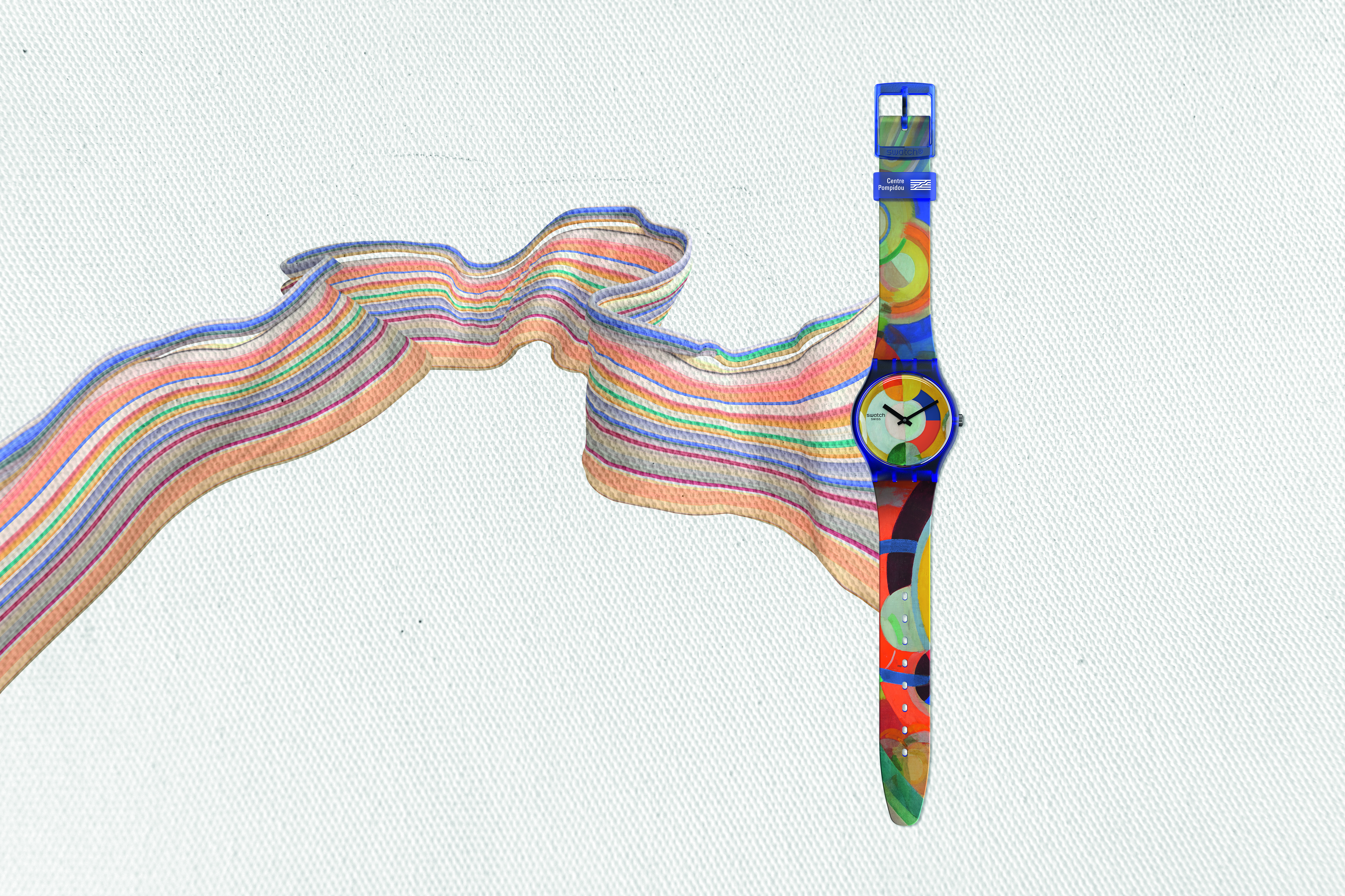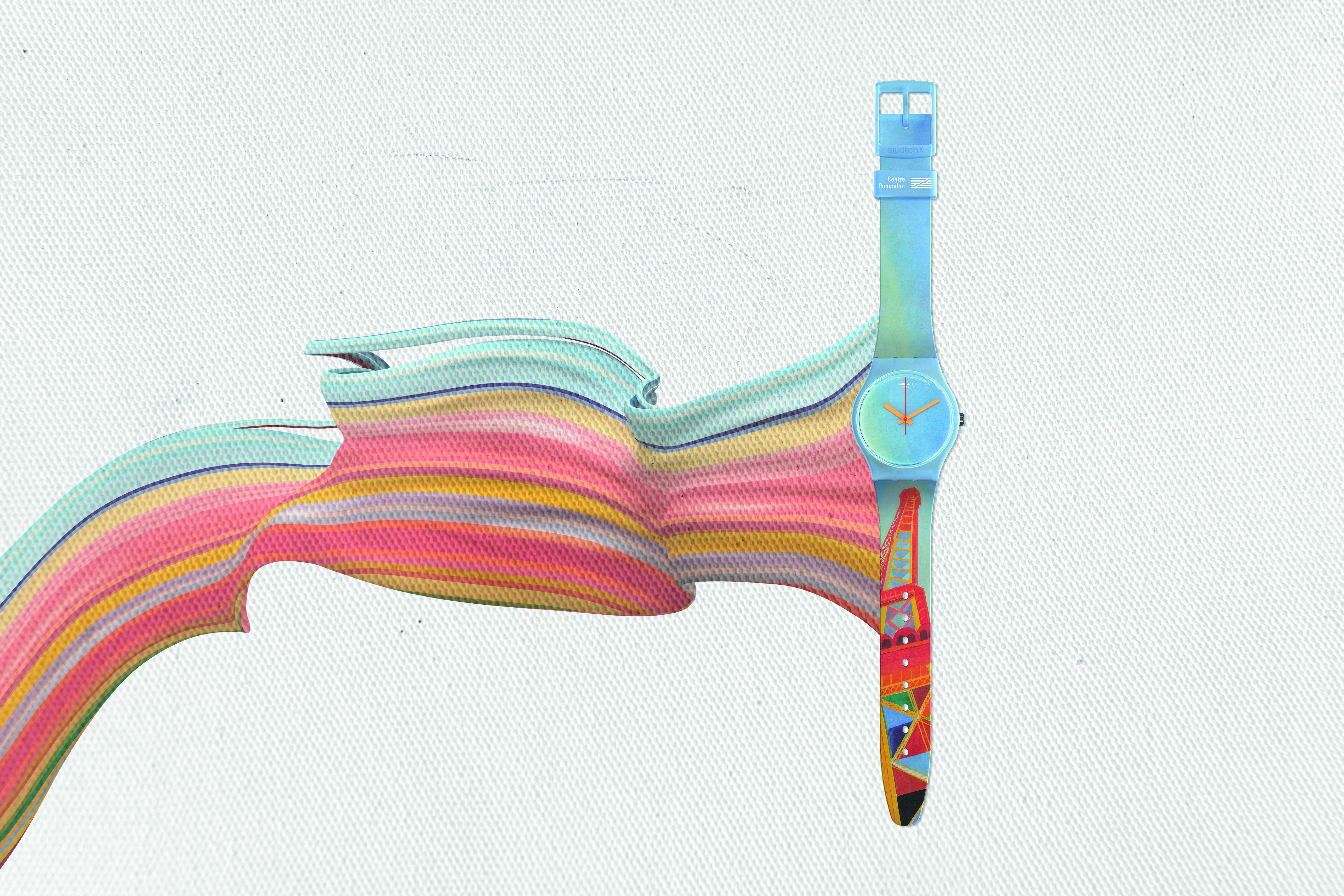 Las sinergias entre Swatch y el Centre Pompidou resultan evidentes. Ambos tienen la misión de lograr que el arte sea accesible para todo el mundo. Son revolucionarios: Swatch lleva el arte a las muñecas y el Centre Pompidou lo lleva a las masas. Los colores vibrantes y los detalles transparentes son las señas de identidad de la marca de relojes suiza, así como del edificio de acero, los tubos de colores primarios y las famosas escaleras mecánicas con paneles de vidrio, conocidas como «oruga», que recorren su lateral y que permite a los transeúntes admirar el arte que guarda en su interior.