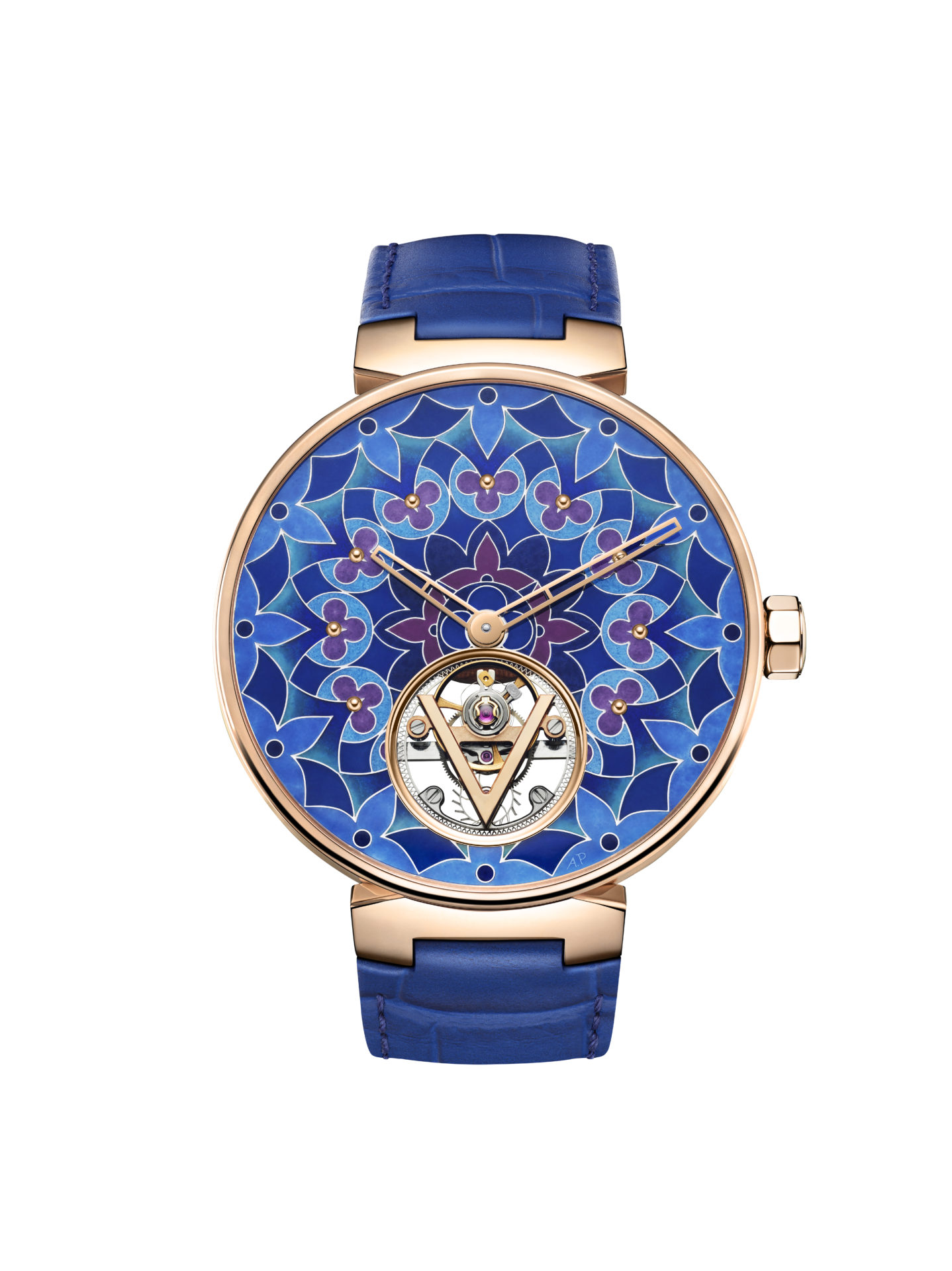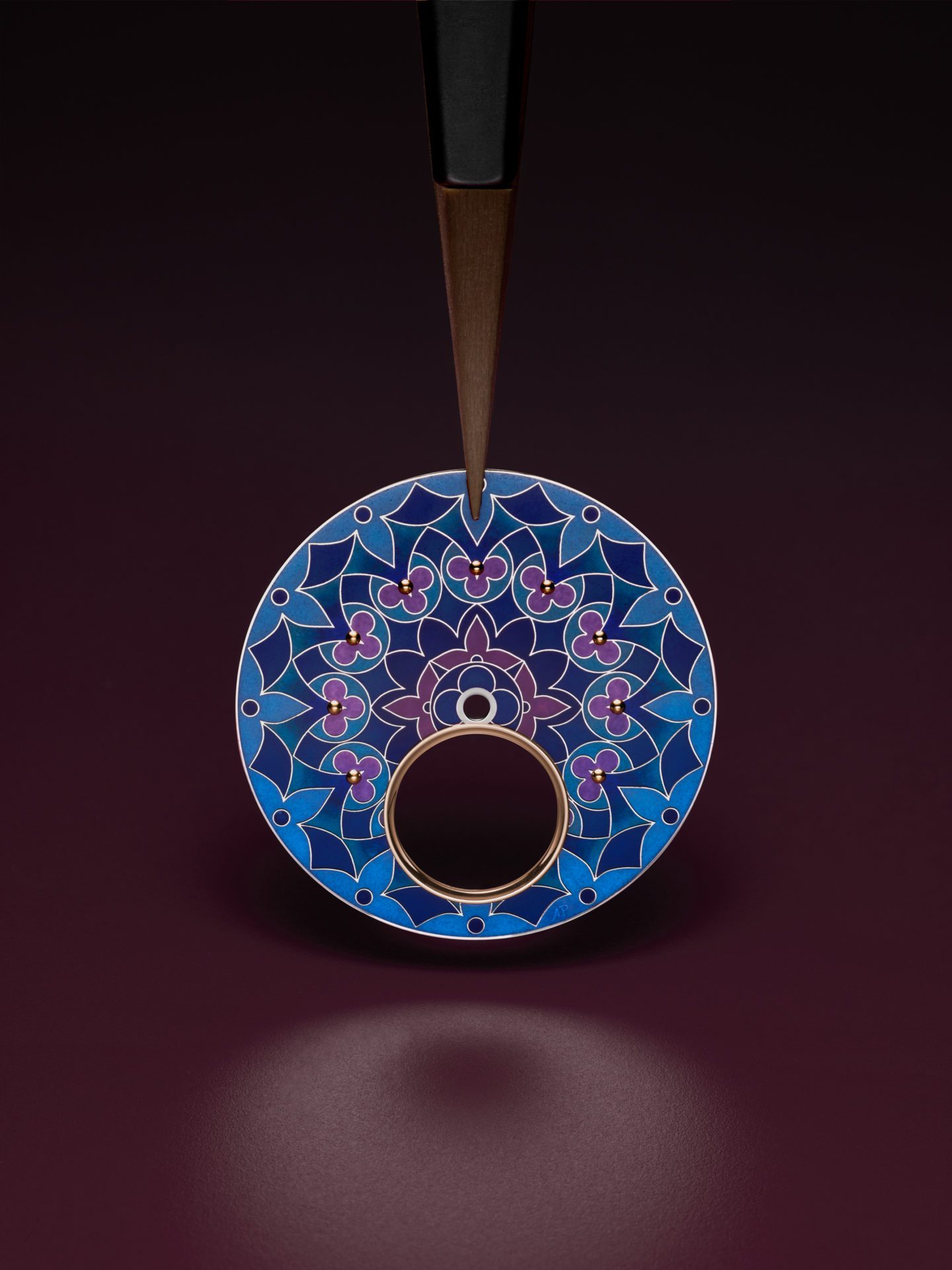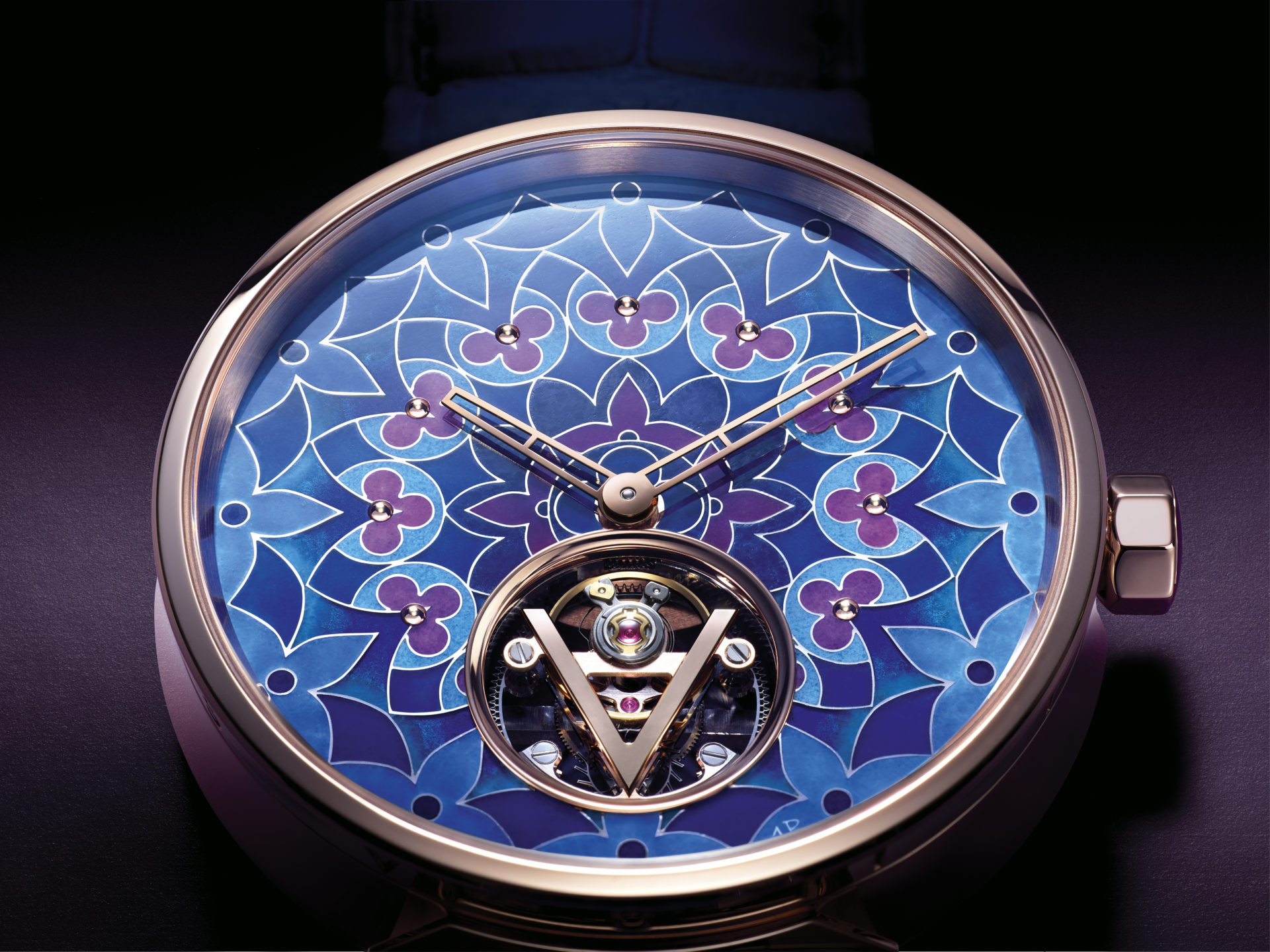 Louis Vuitton optó por dejar brillar los detalles del esmalte cloisonné dejando el «lienzo» de la esfera sin firmar. La totalidad de la esfera está dedicada a los esmaltes de Anita Porchet. Púrpura es el color más difícil de esmaltar. Fueron necesarias varias semanas de investigación para perfeccionar los tonos utilizados en esta creación.