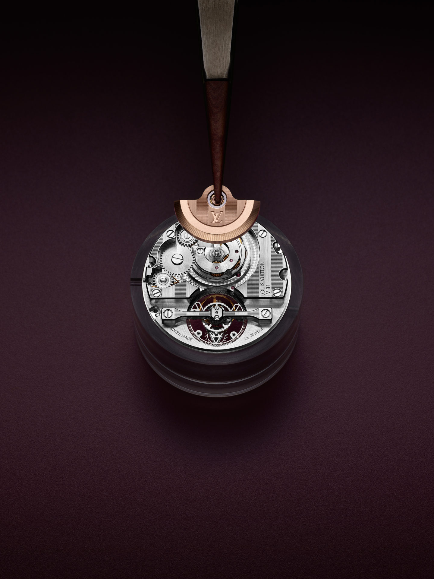 Para que el Tambour Moon Flying Tourbillon esté a la altura, Louis Vuitton decidió equipar el reloj con uno de sus más bellos movimientos automático: el calibre LV 81 con tourbillon volante, diseñado, desarrollado y ensamblado íntegramente en La Fabrique du Temps Louis Vuitton. El emblemático regulador situado a las 6 horas luce un diseño refinado, que revela la V de Gastón-Louis Vuitton en el corazón de la jaula del tourbillon volante. En el fondo de la caja, un cristal de zafiro abre una ventana al micro rotor y al mecanismo del reloj. Su delicado adorno recuerda al lienzo a rayas Trianon creado en 1858.