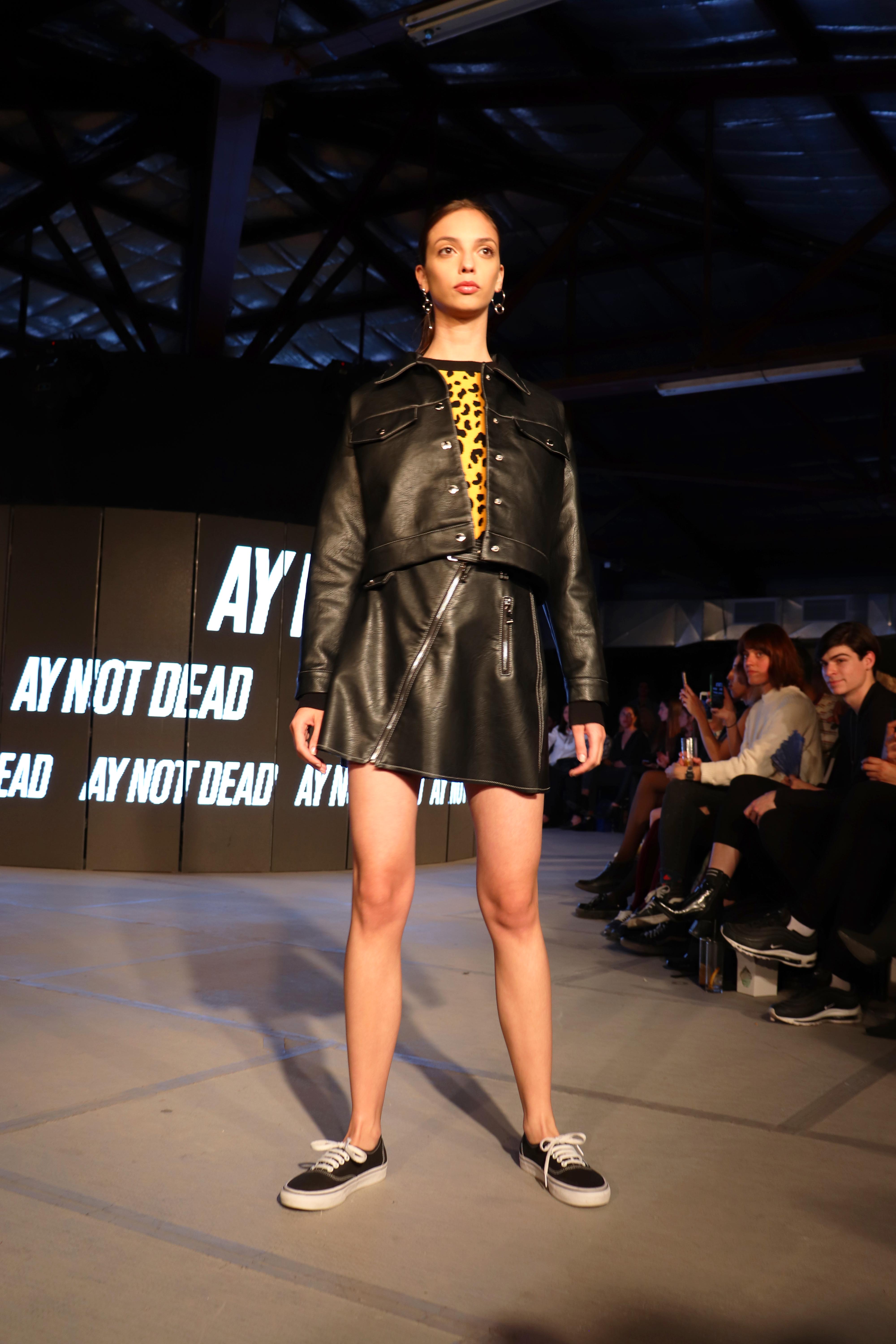 Ay Not Dead cerró el primer día de Círculo Moda, con una propuesta de colores negro, blanco, amarillo, celeste, naranja y rosa. Para las mujeres presenta espaldas descubiertas, escotes, camperas y polleras de cuero.