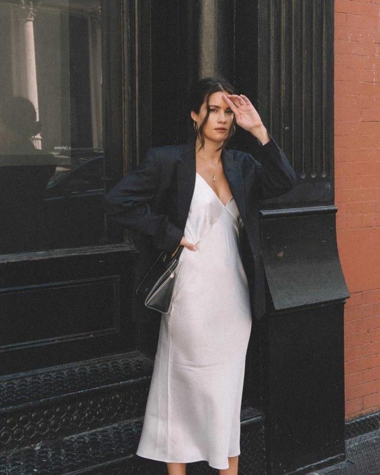 La diseñadora fue vista con un espectacular vestido largo lencero en color blanco de su propia colección, un diseño precioso con la espalda al descubierto que se conoce en inglés como «sleep dress» (vestido para dormir, traducido) y que aquí llamamos vestido lencero.